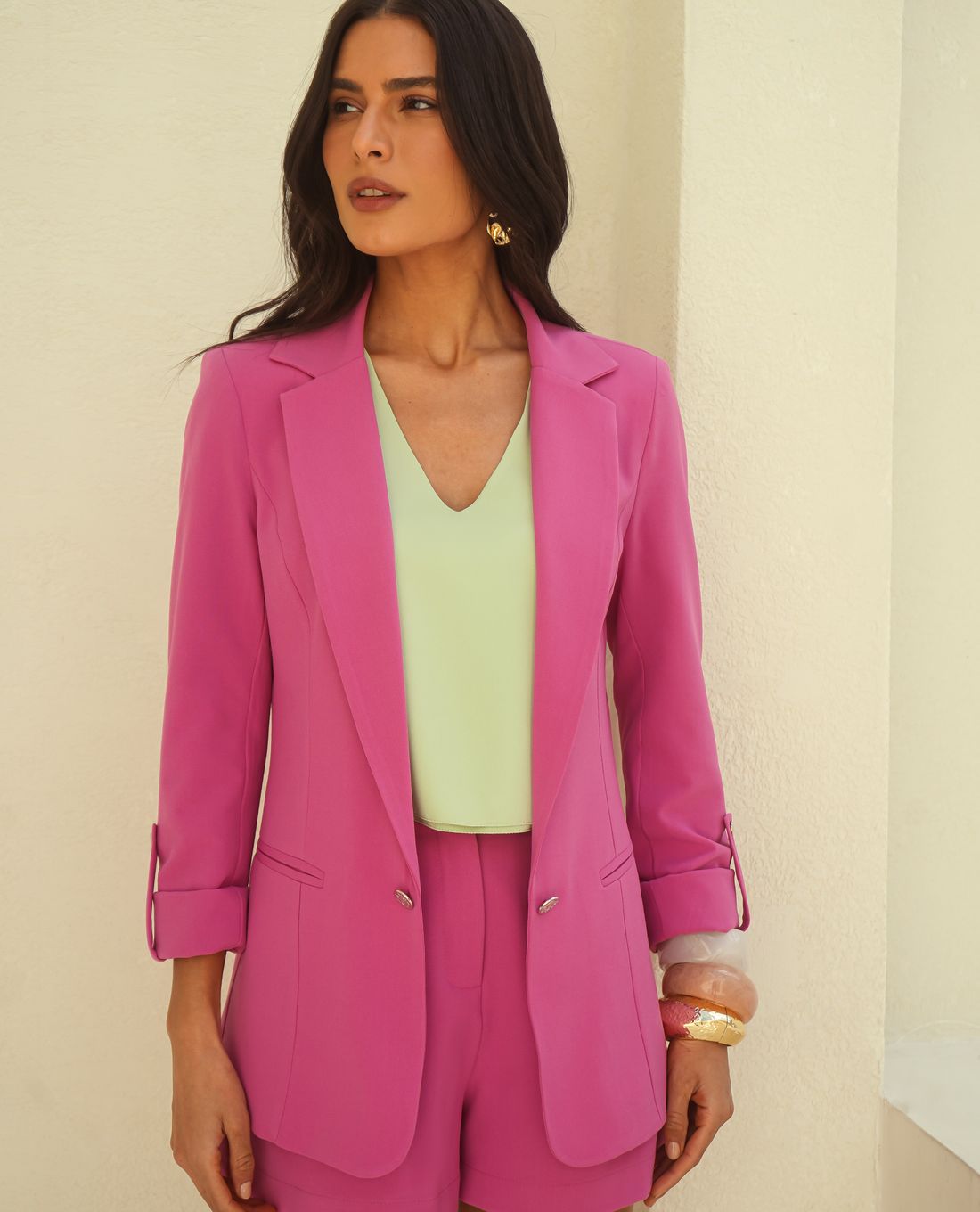 Clássico modelo de blazer boyfriend em alfaiataria mista de viscose com elastano. Possui forro, bolsos laterais com vivo, detalhe de martingale para dobrar a manga e botões de metal.