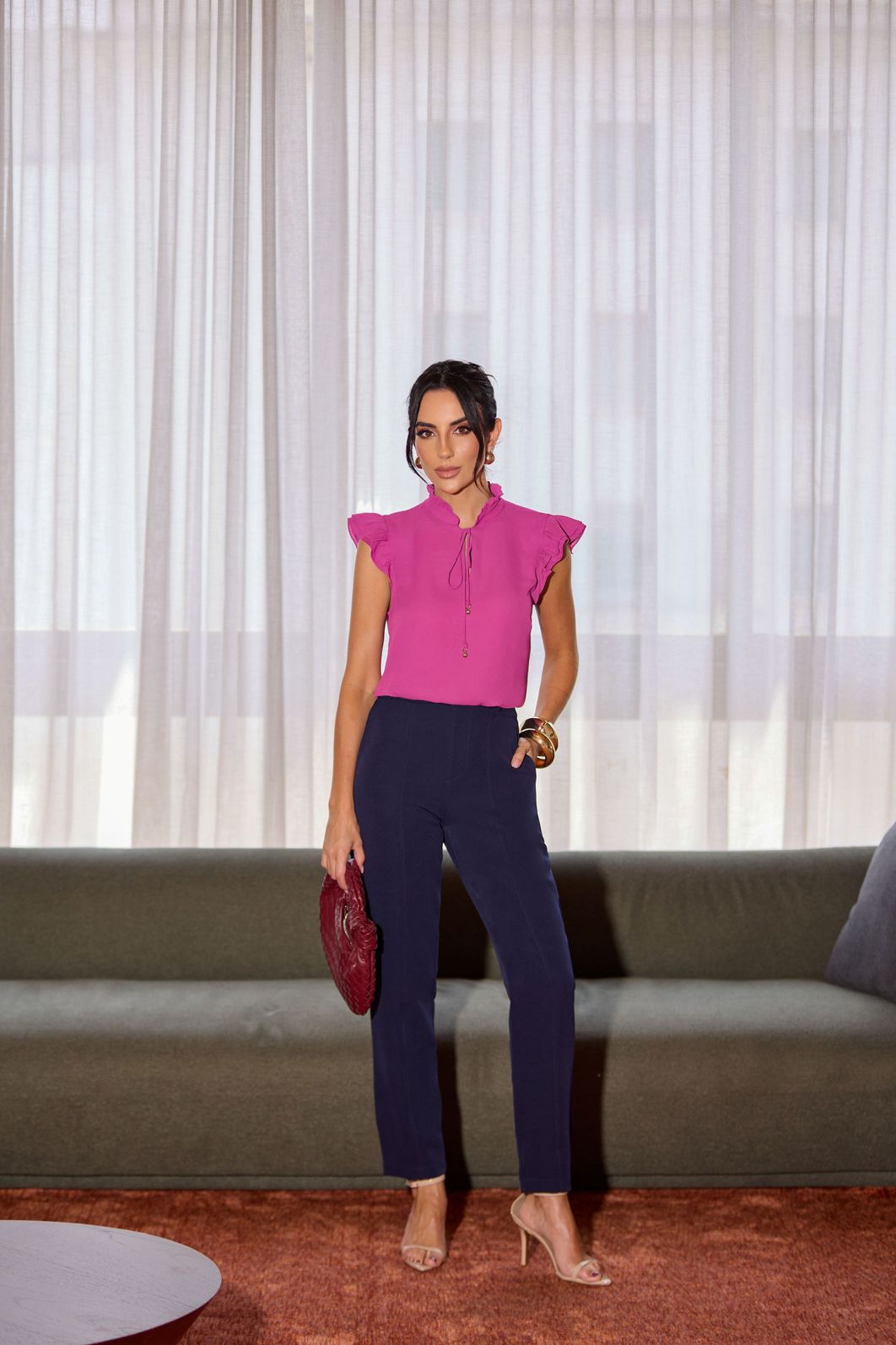 Os detalhes em babado trazem delicadeza ao visual, enquanto as ponteiras adicionam charme e estilo à peça, tornando-a perfeita tanto para o dia a dia quanto para ocasiões especiais.