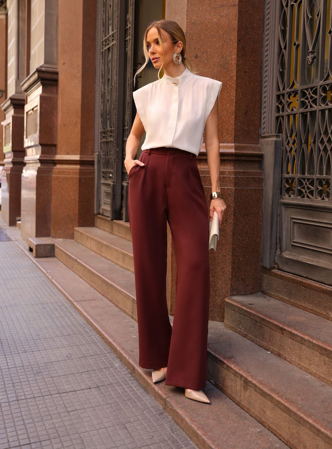Combine com calça de alfaiataria para um conjunto sofisticado e monocromático ou use com saias midi para uma proposta elegante e feminina. Acessórios dourados harmonizam perfeitamente com o detalhe da gola.