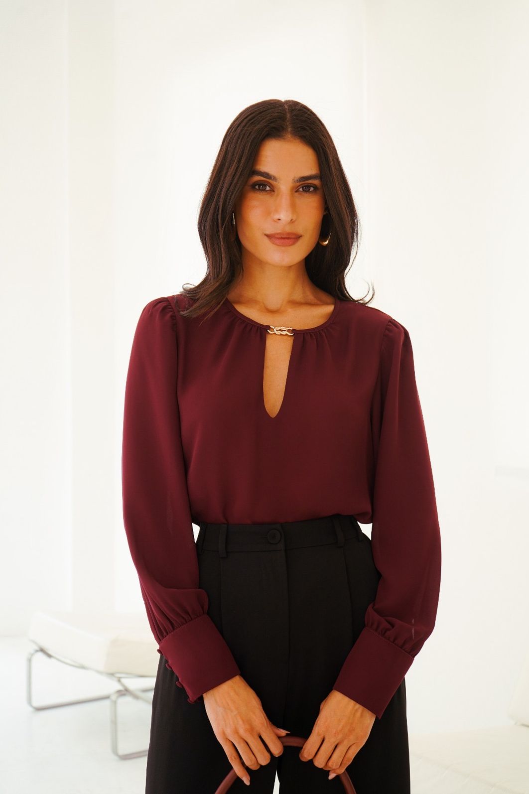 A blusa em crepe com decote e aviamento de metal da Donna Ritz é a peça ideal para quem busca sofisticação com um toque contemporâneo. O detalhe metálico no decote traz elegância e destaca a região do colo de forma refinada.