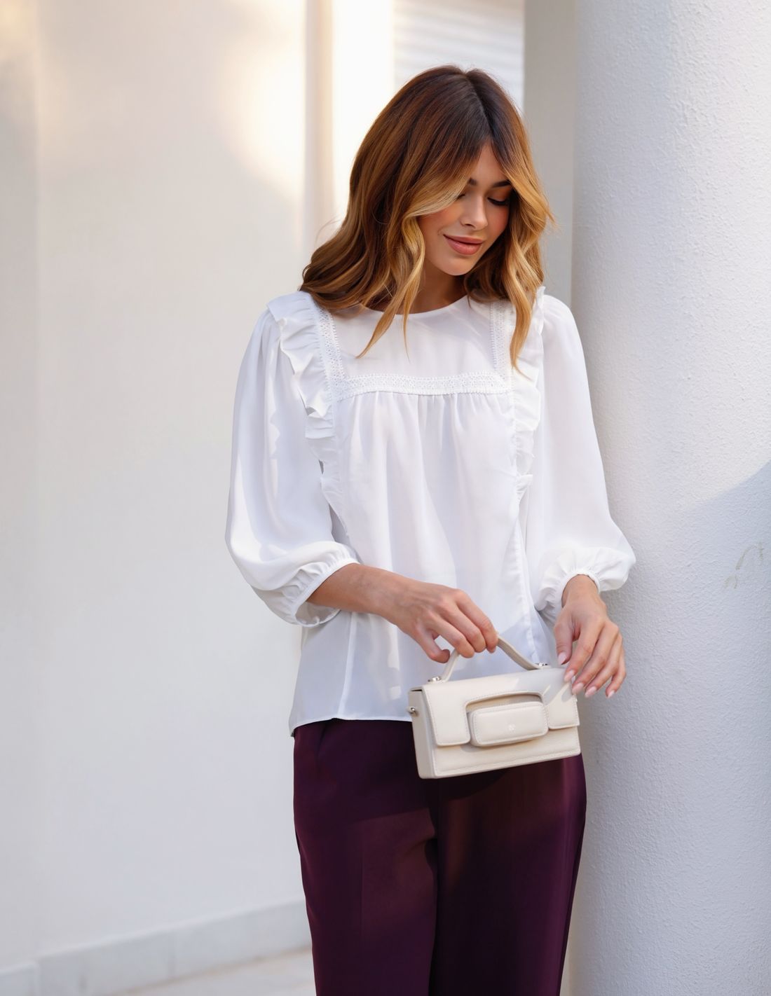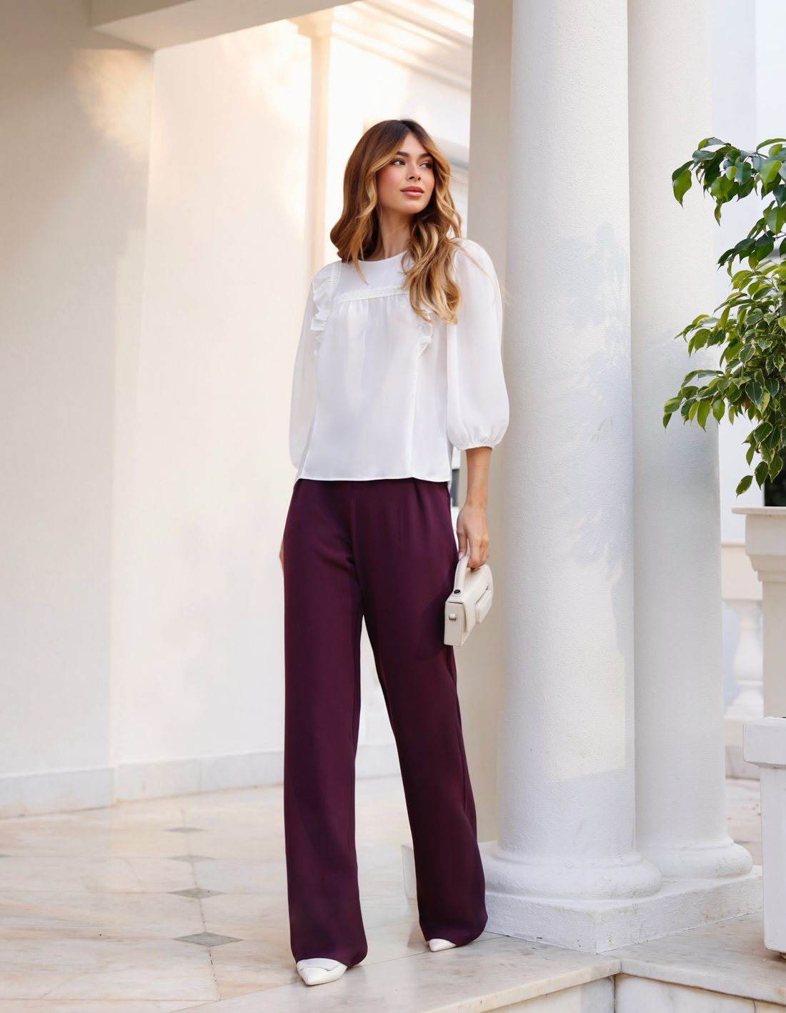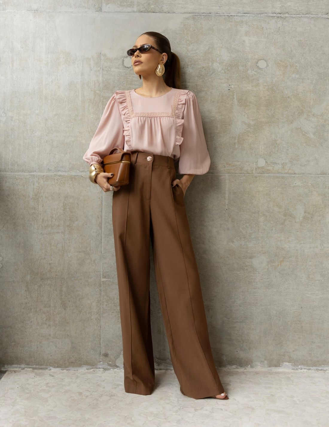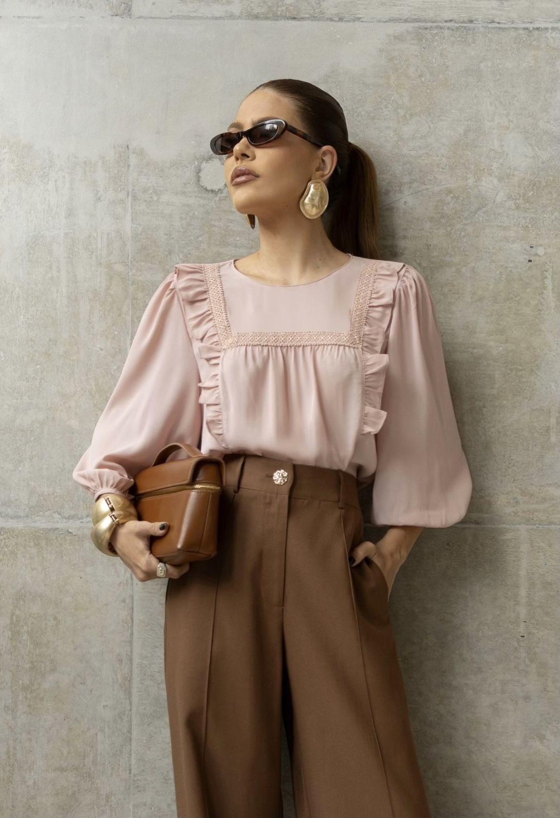 Versátil e elegante, é uma peça ideal para compor produções que vão do trabalho a ocasiões especiais, combinando perfeitamente com calças de alfaiataria, saias ou jeans para um look moderno e feminino.