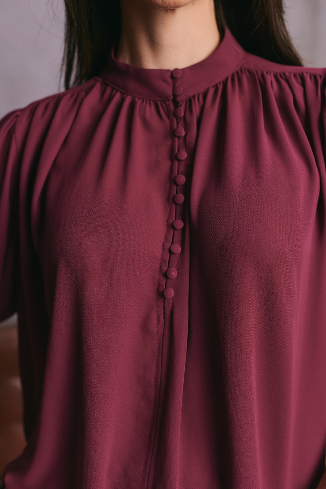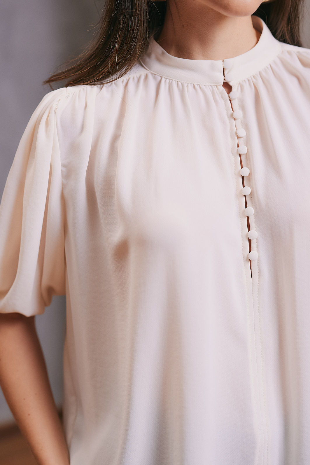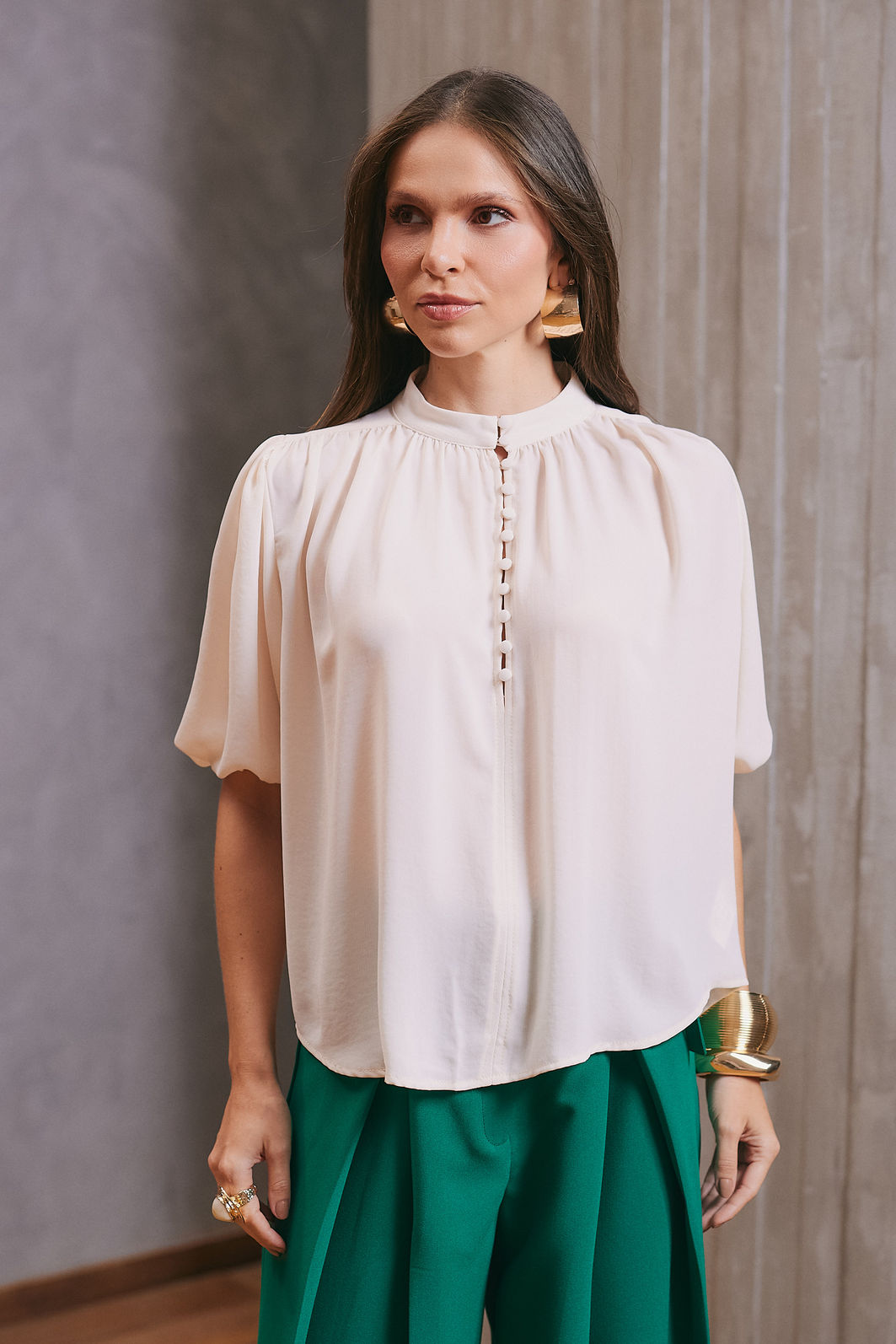 Possui gola arredondada, mangas levemente bufantes e franzidos frontais e posteriores, que acrescentam delicadeza e movimento à peça.