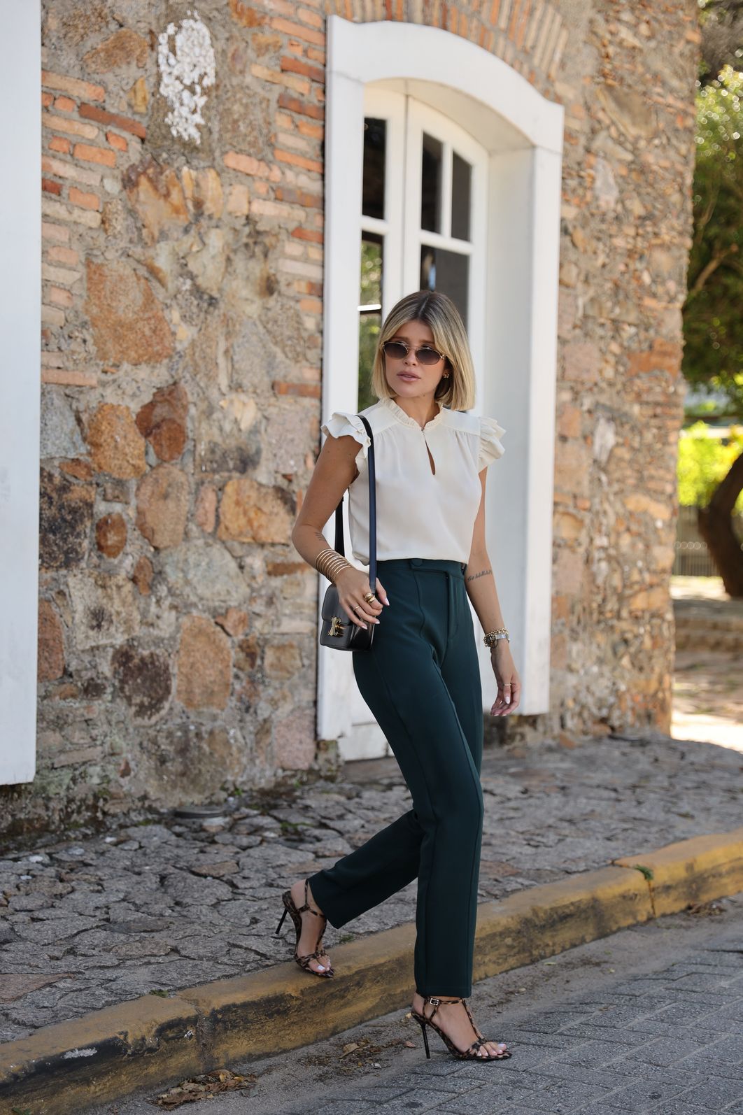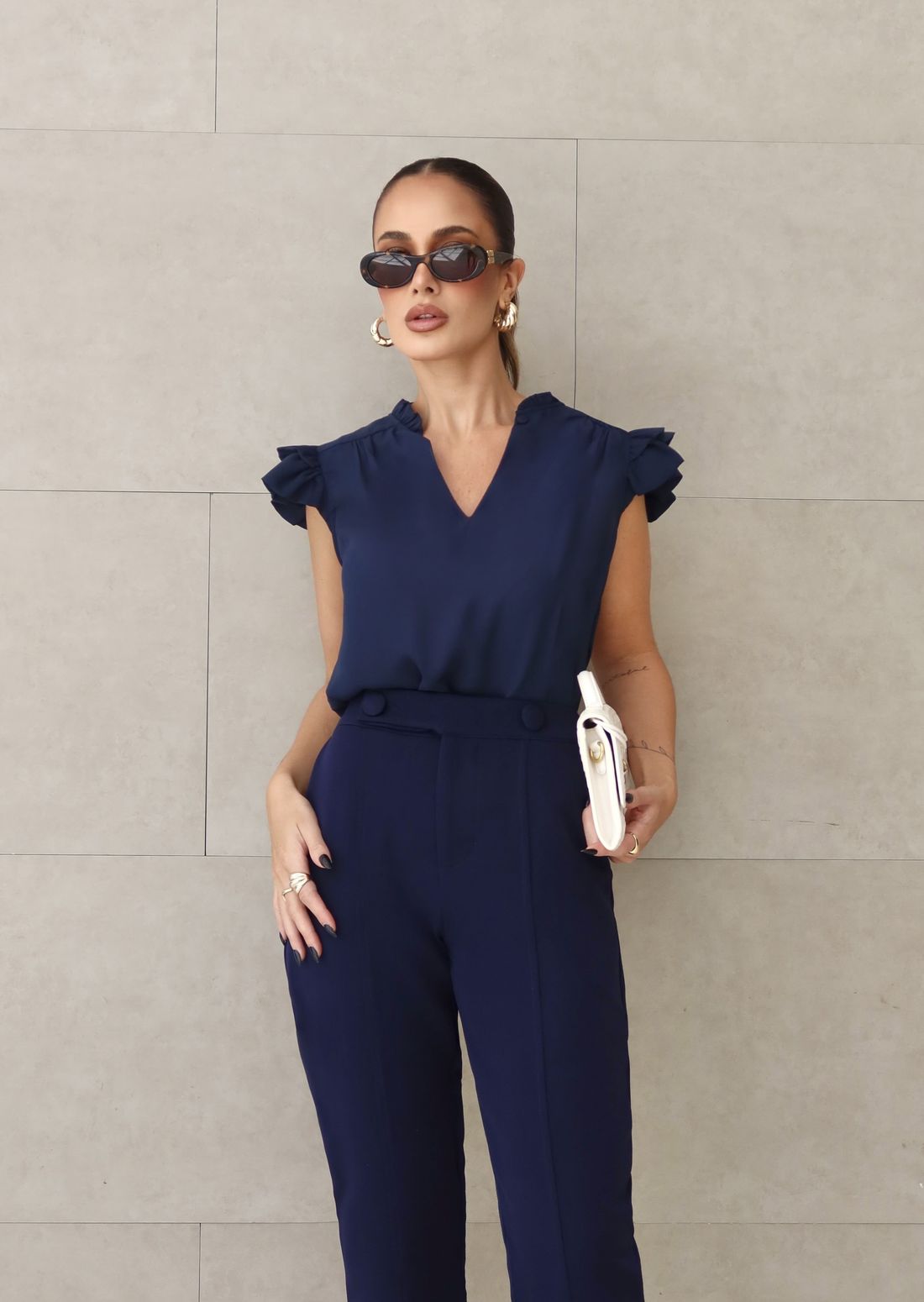 As mangas com babados trazem um toque romântico, equilibrando perfeitamente com a modelagem confortável e elegante.
