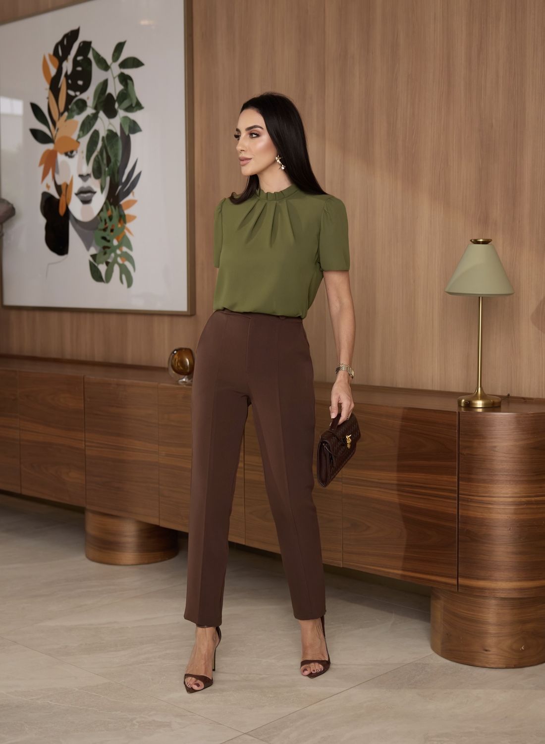Blusa feminina confeccionada em crepe leve, com caimento elegante e toque sofisticado.