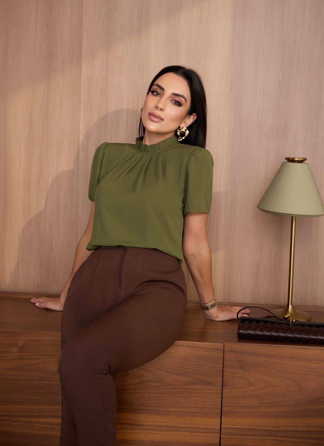 As mangas curtas com leve volume complementam a proposta refinada da peça, enquanto a modelagem confortável garante versatilidade para diferentes ocasiões.