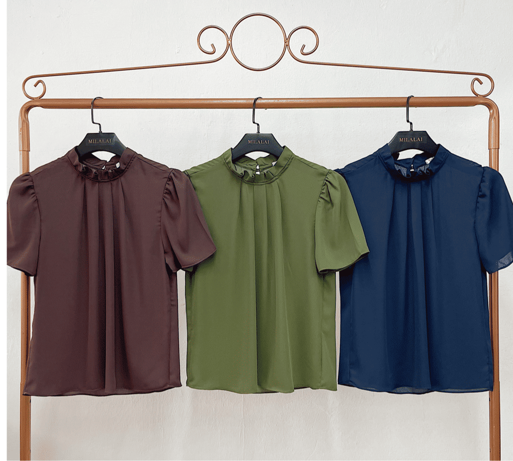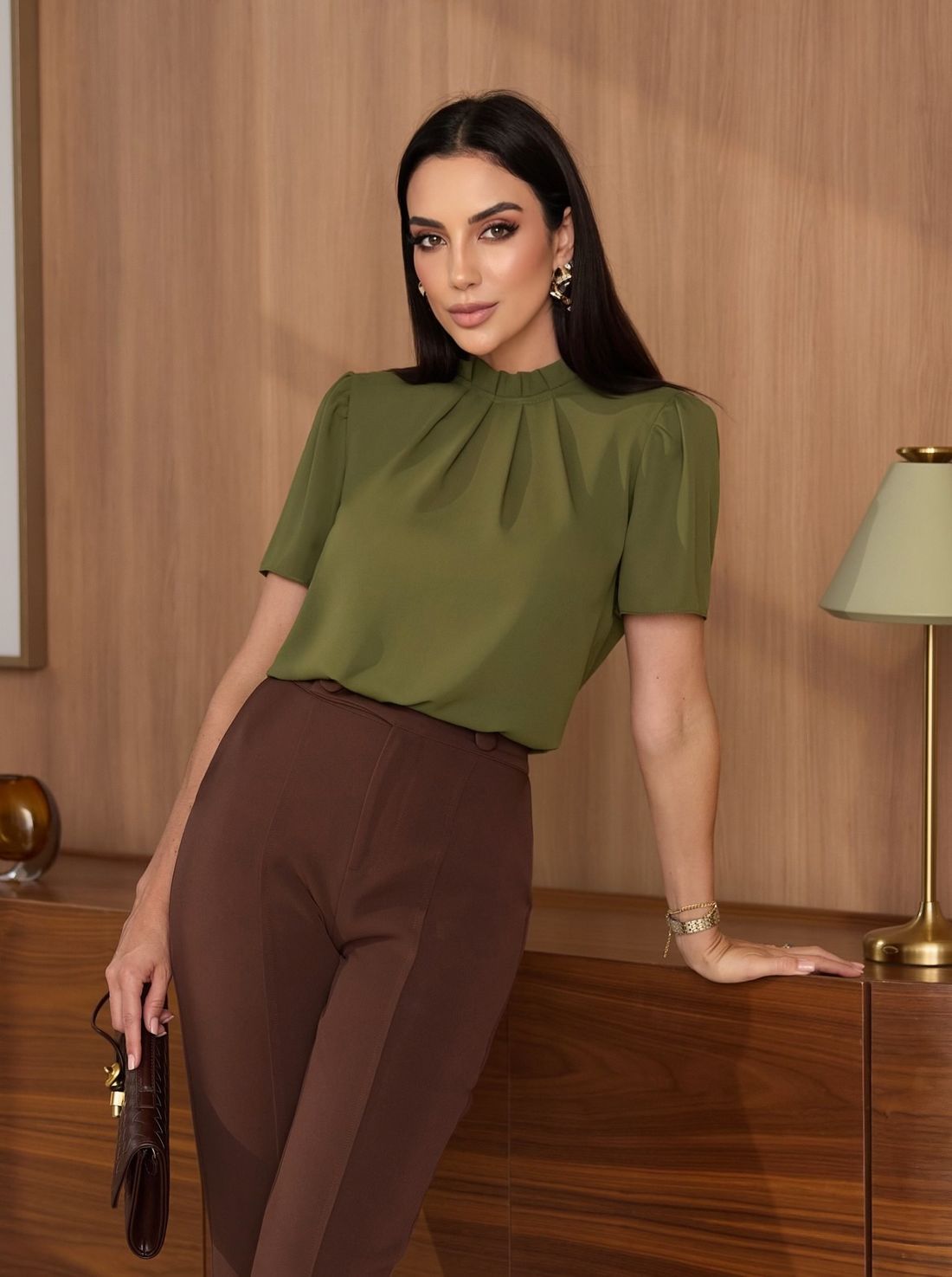O modelo possui gola alta com delicado babadinho e pregas frontais, detalhes que valorizam o colo e trazem feminilidade ao visual.