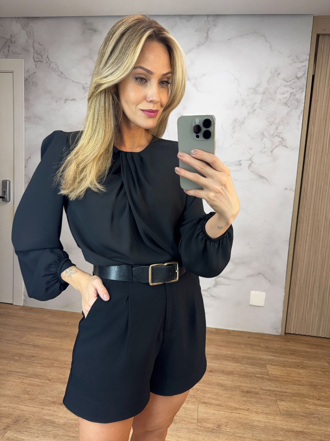 O destaque fica por conta das pregas no decote, que adicionam um toque refinado e feminino ao visual. Possui punhos com elástico, garantindo ajuste confortável, e fechamento nas costas em botão, que completa o acabamento com delicadeza.