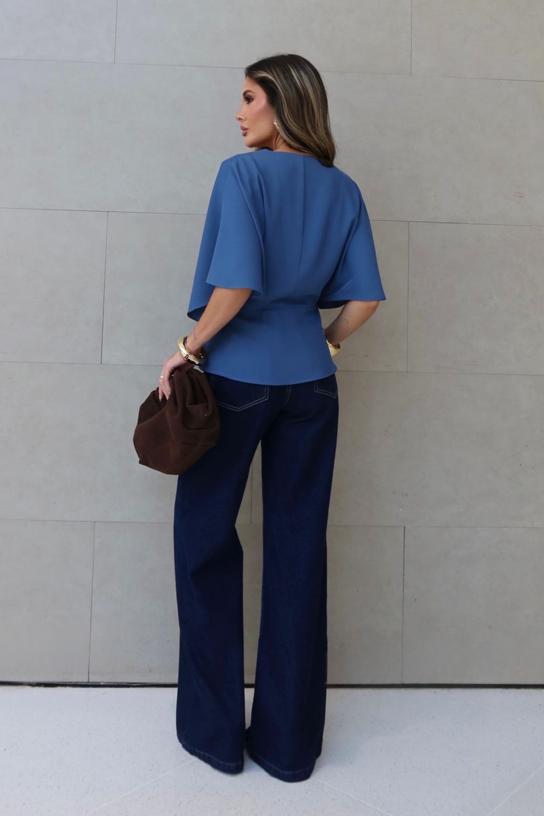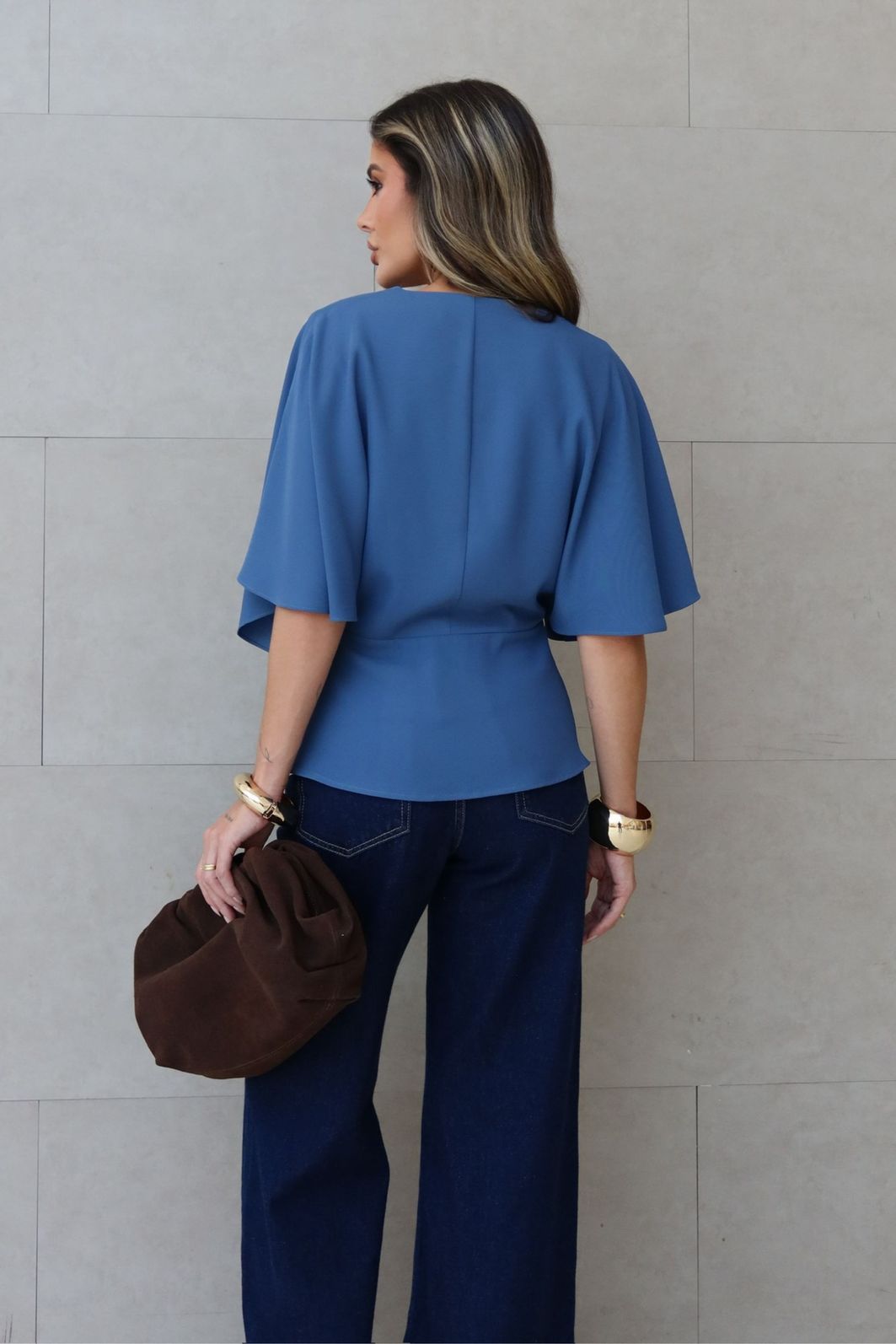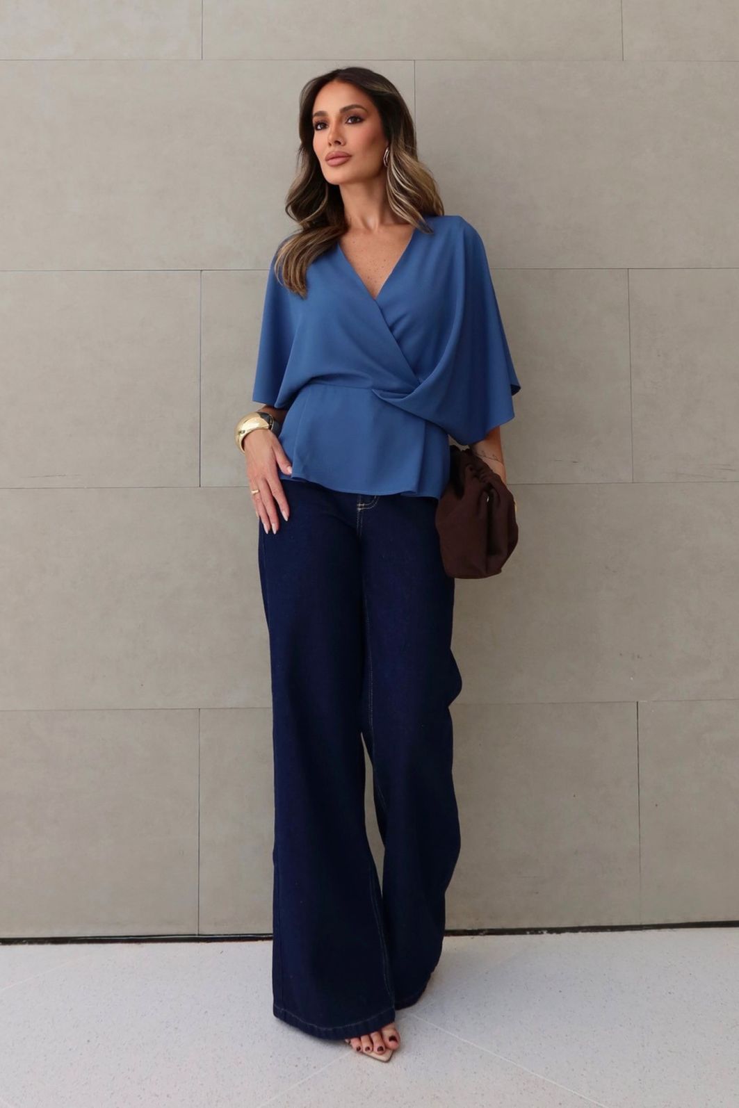 Blusa em alfaiataria com decote V e modelagem transpassada é uma peça-chave para um visual elegante e atemporal. Seu design valoriza o colo e alonga a silhueta, trazendo feminilidade na medida certa.