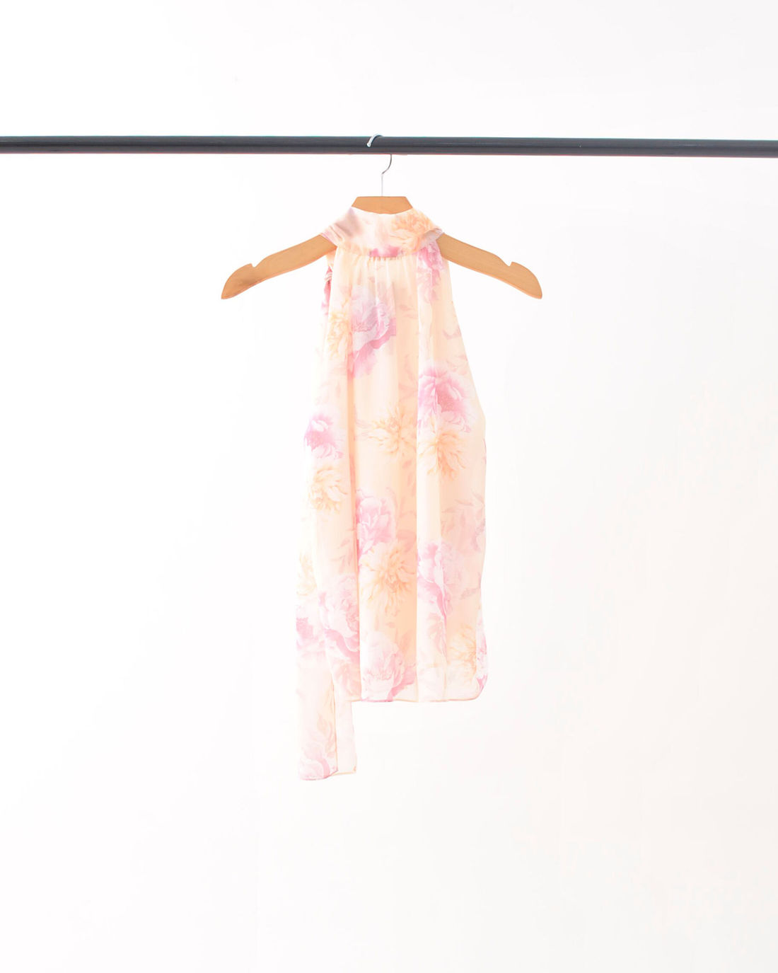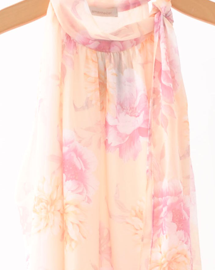 O design sem mangas e a gola alta com faixas para amarração adicionam charme e modernidade, permitindo diferentes formas de uso.