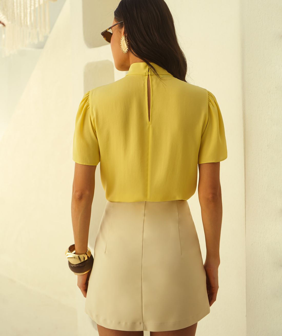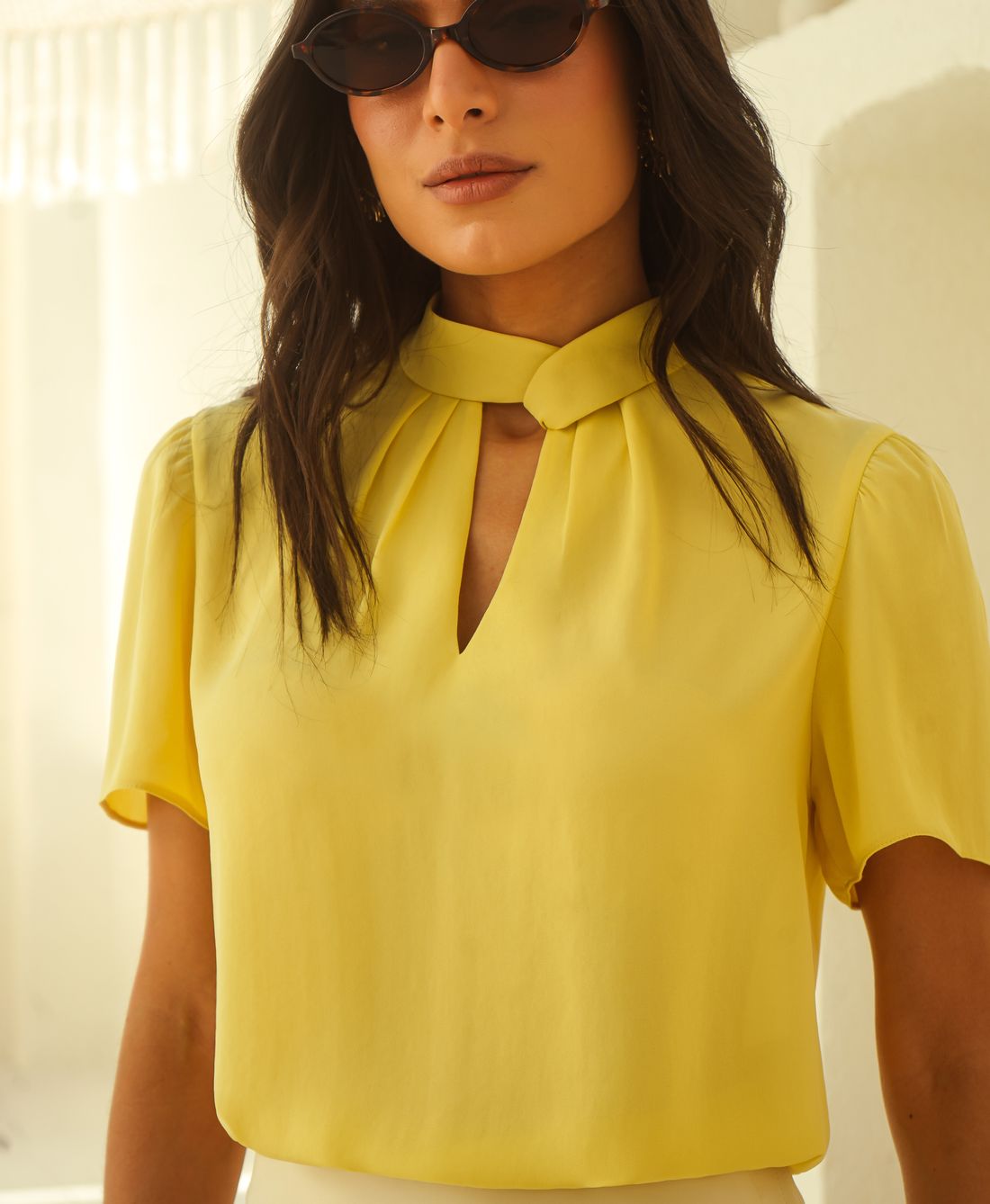 Elegância e sofisticação em cada detalhe. A blusa em crepe liso traz um caimento leve e confortável, perfeito para compor looks modernos e versáteis. Seu design conta com gola transpassada e decote vazado, que adicionam um toque de charme e feminilidade à peça. As pregas sutis na parte frontal garantem um caimento fluido e elegante, enquanto o fechamento por botão nas costas proporciona praticidade e um acabamento delicado. Ideal para combinações que vão do office look ao casual chic.