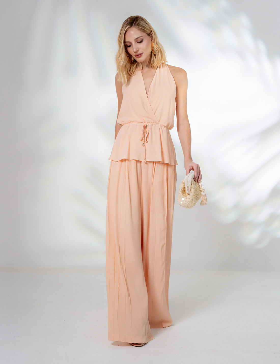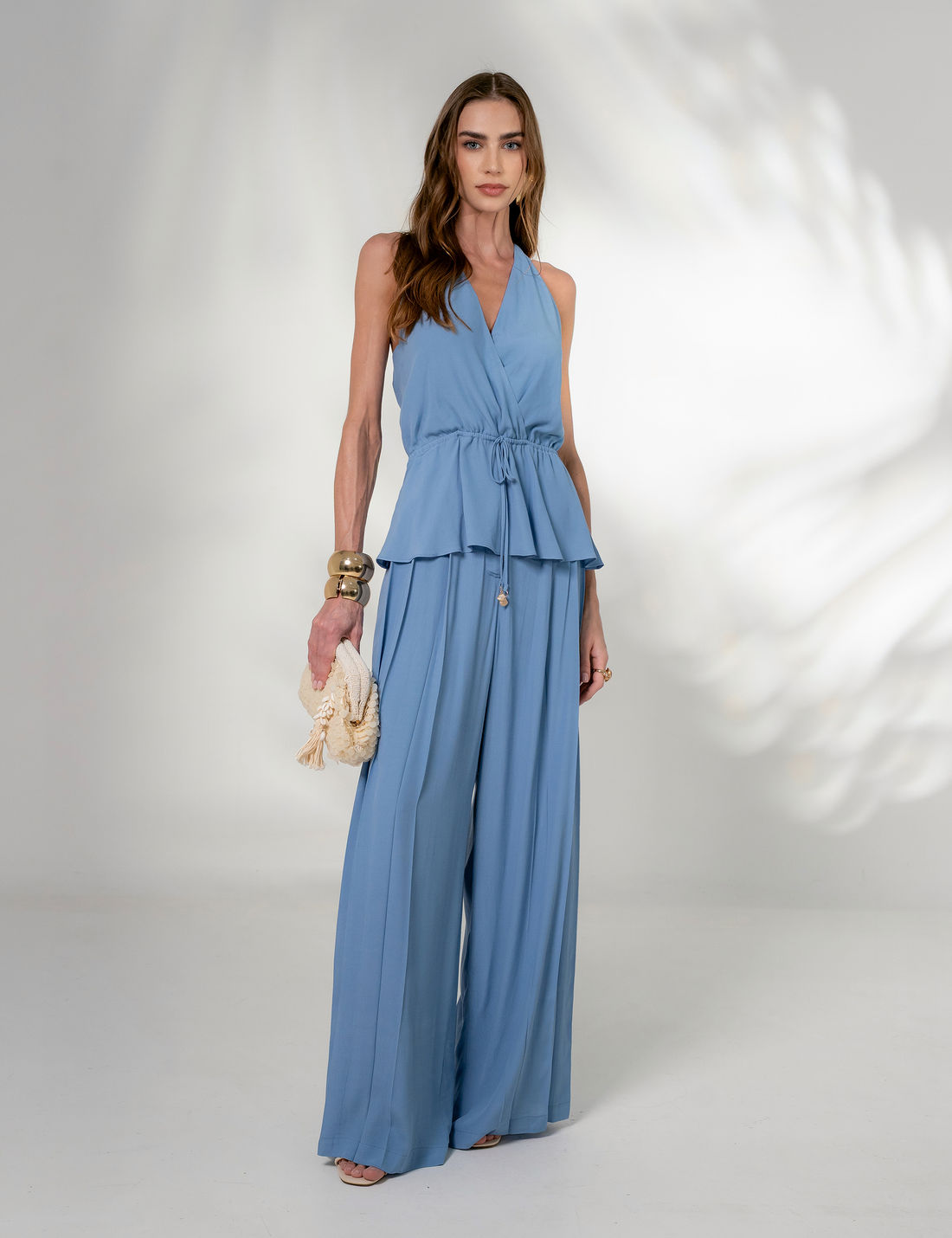 O decote V transpassado valoriza o colo com elegância, enquanto o fechamento posterior por abotoamento garante praticidade.