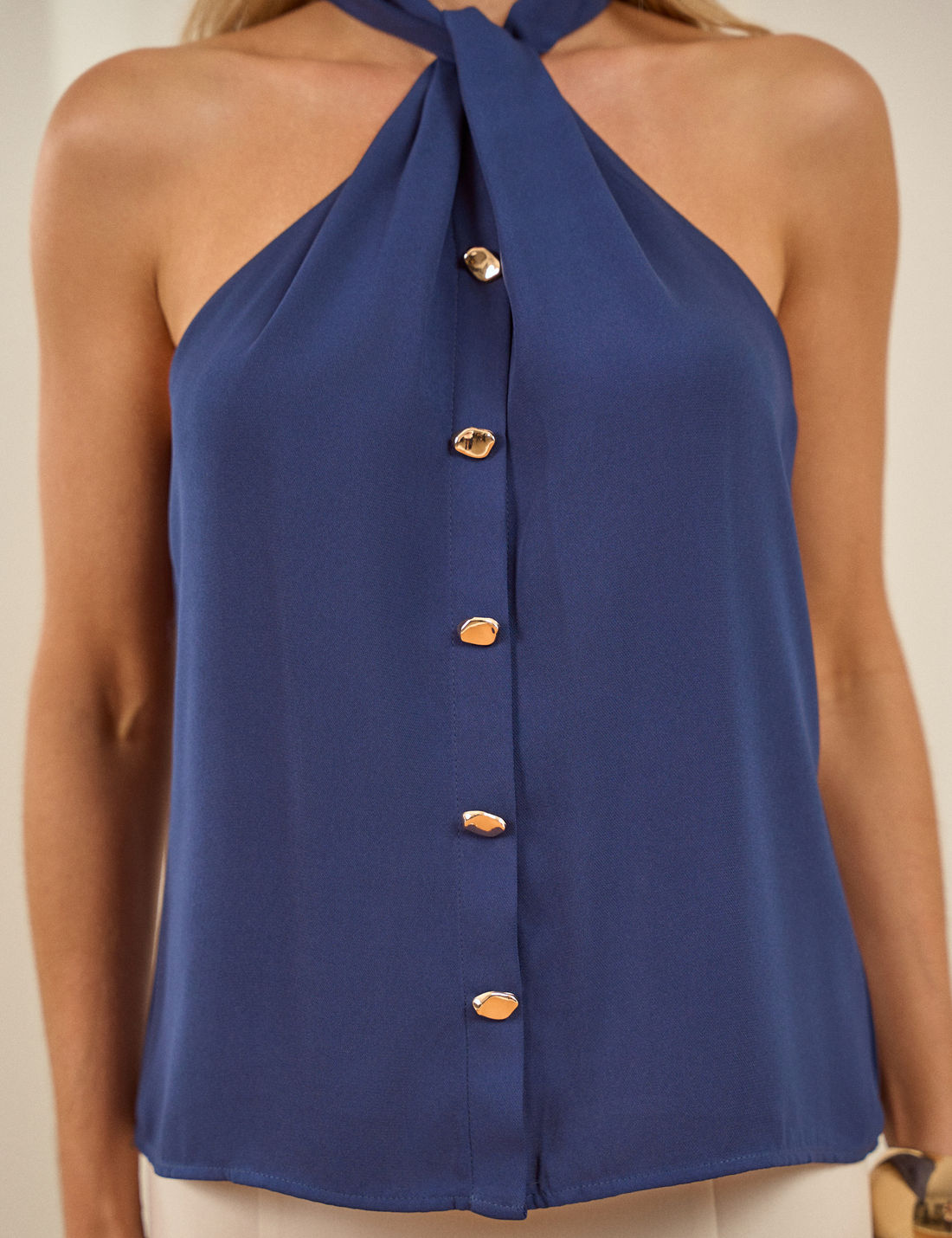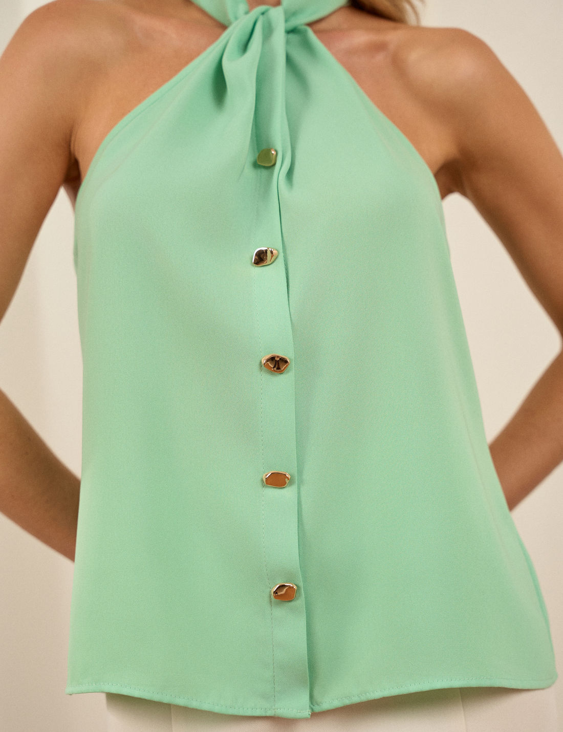Blusa confeccionada em crepe, com caimento leve e sofisticado que transmite feminilidade e delicadeza. Apresenta gola com detalhe torcido , sem mangas, valorizando o colo de forma elegante.