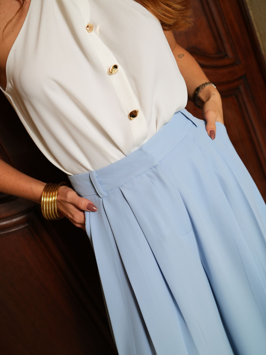 Nas costas, o fechamento em botões com azélias garante um acabamento refinado e sutil. Versátil e atemporal, é a escolha perfeita para compor produções elegantes ou casuais com estilo e personalidade.