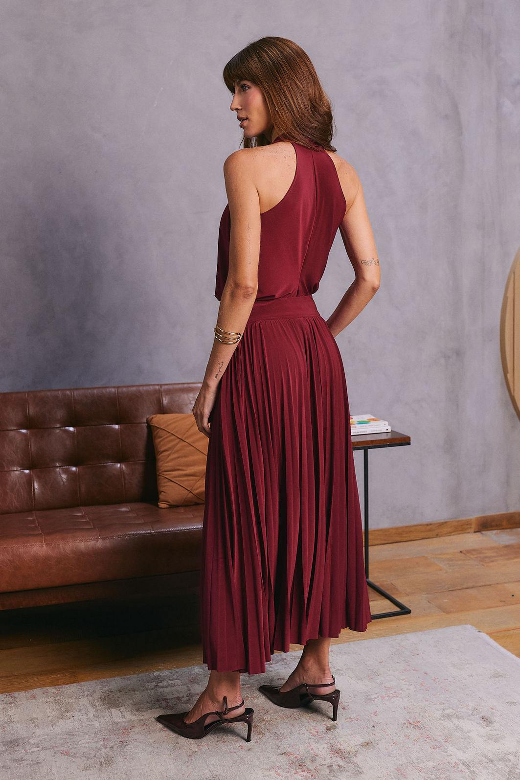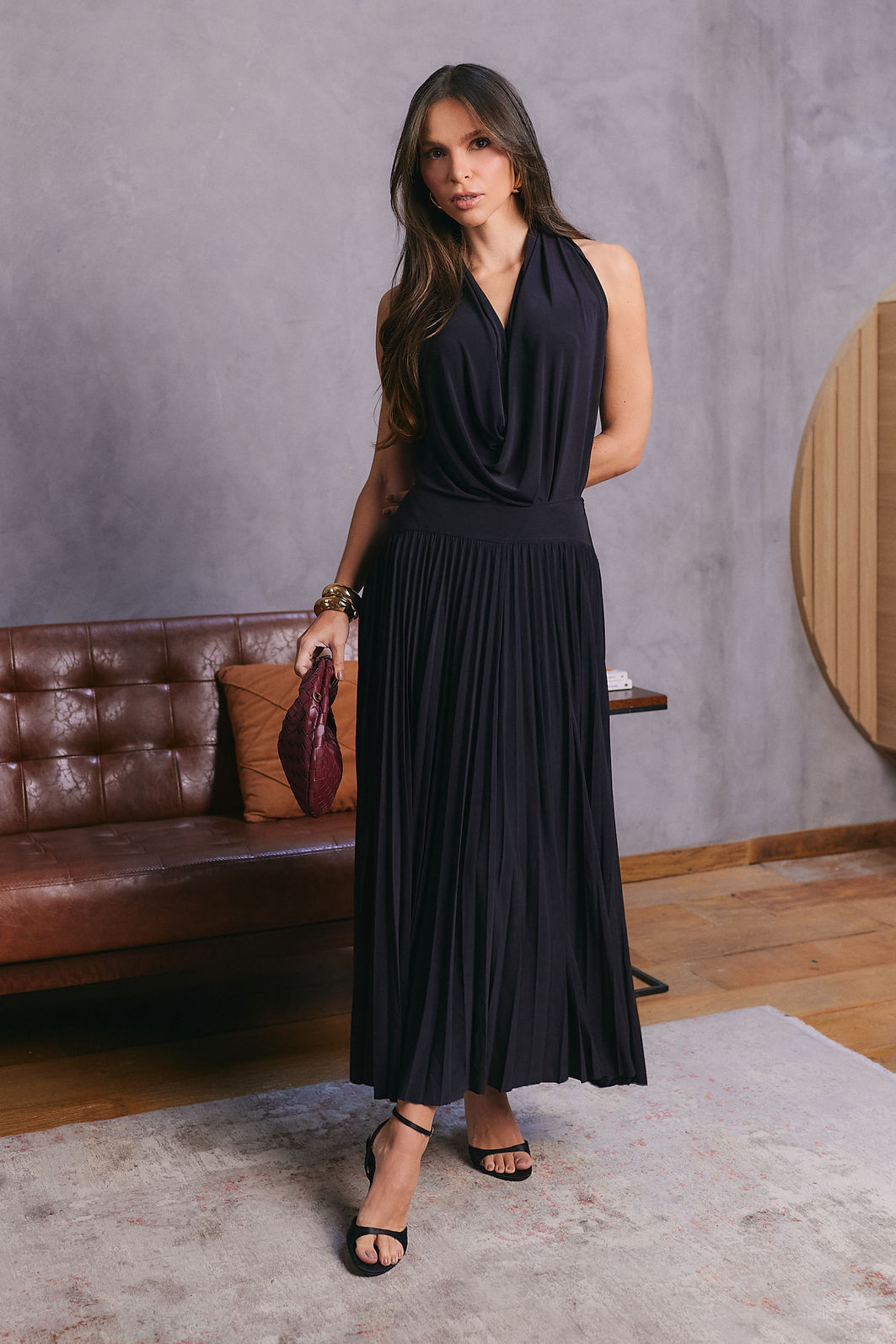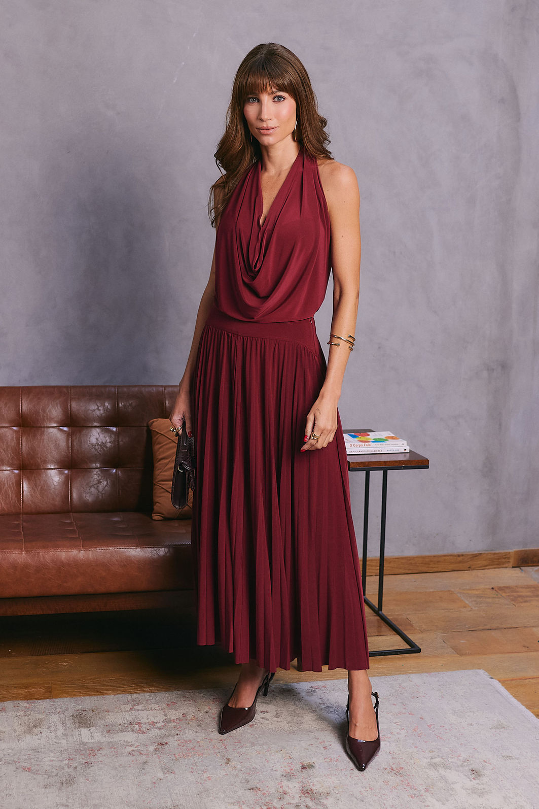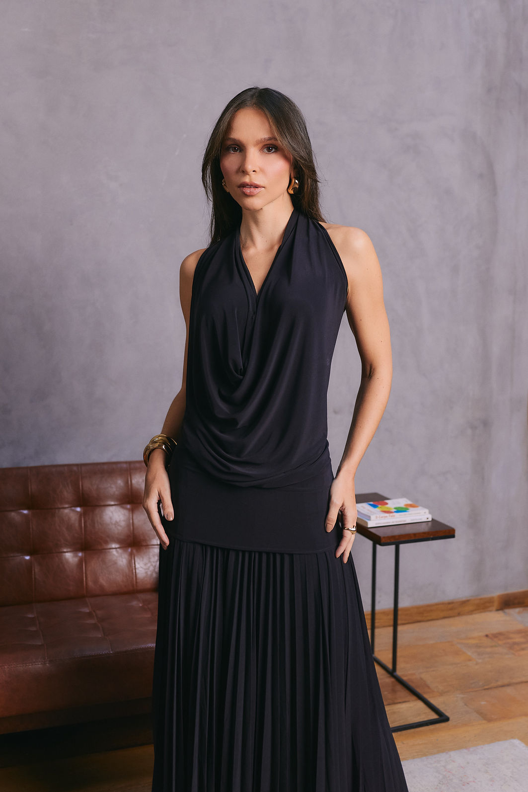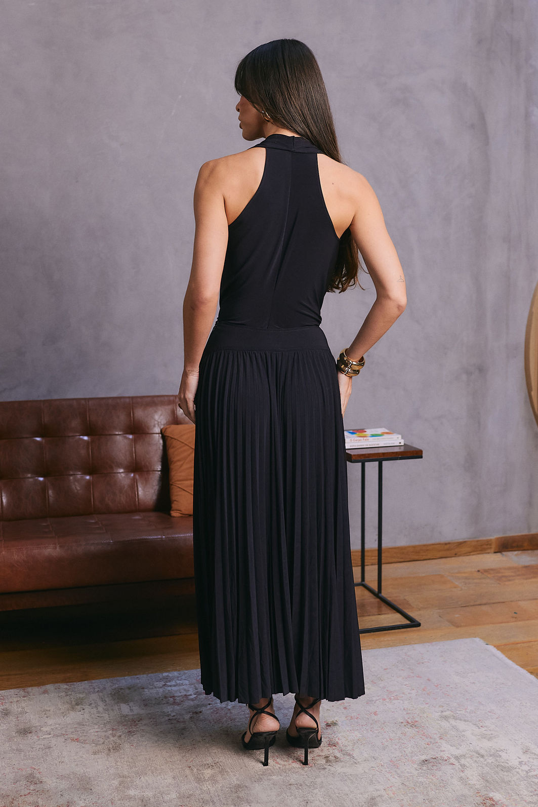 Possui decote degagê, sem mangas e recorte posterior, que garantem caimento leve e elegante.