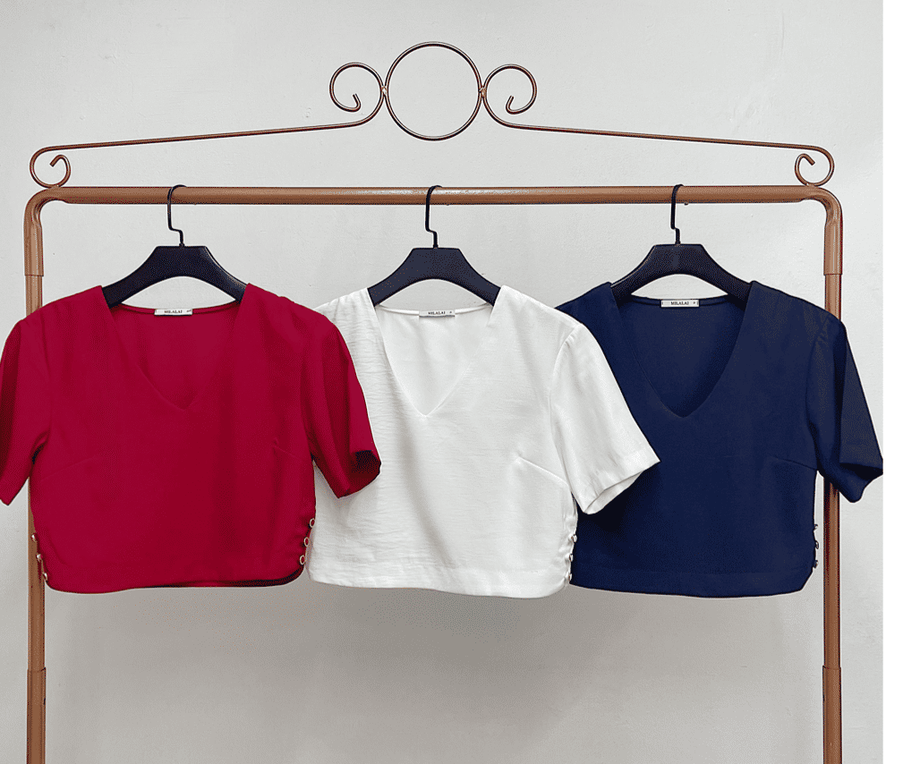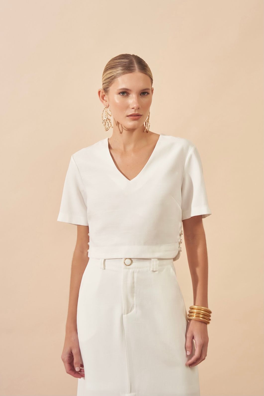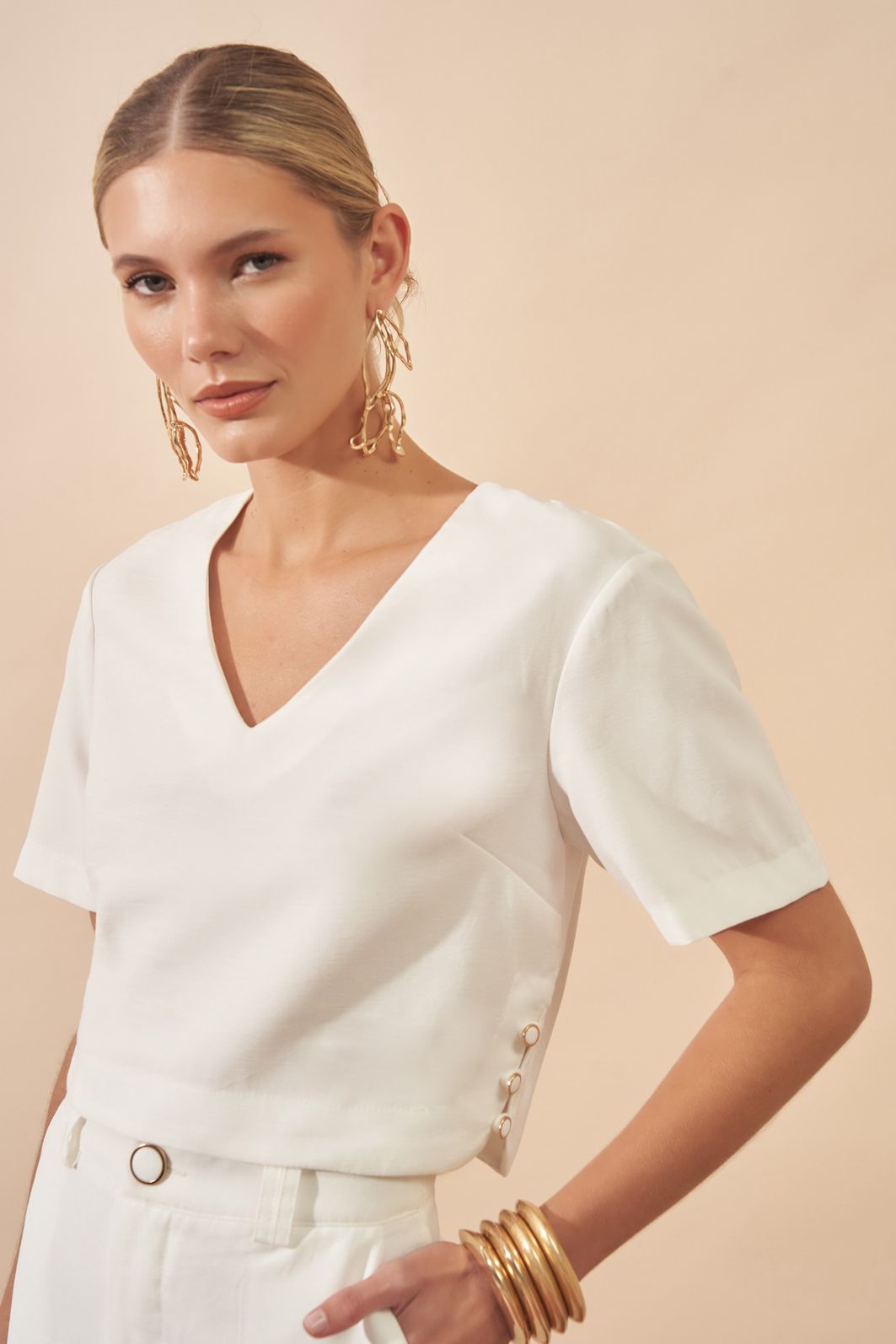 O decote em V com detalhe de torção no pescoço valoriza o colo, enquanto os botões laterais adicionam um charme moderno e delicado. Ideal para compor looks casuais ou profissionais, combinando facilmente com saias, calças ou shorts.