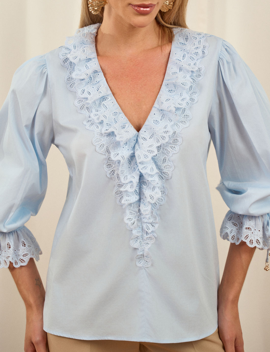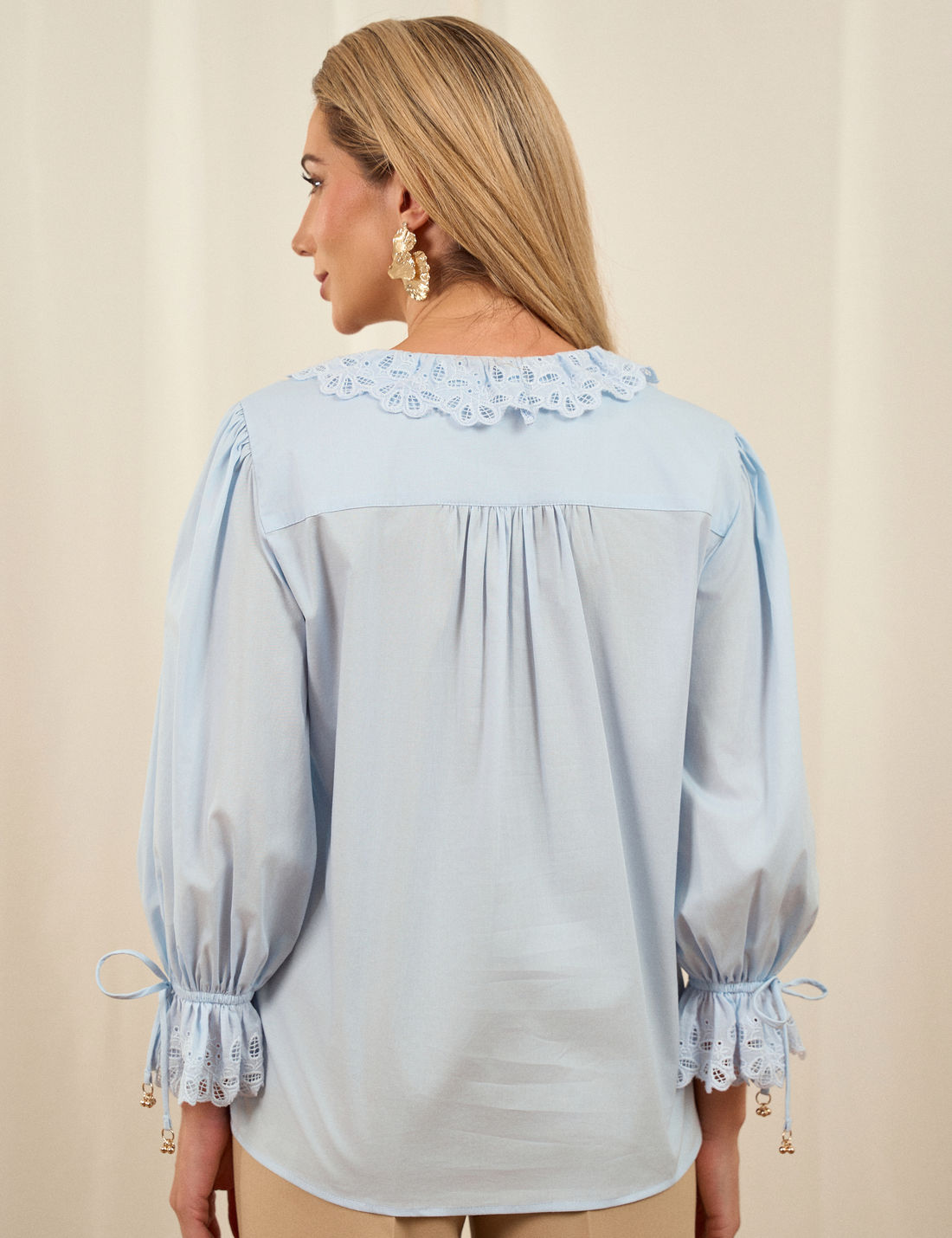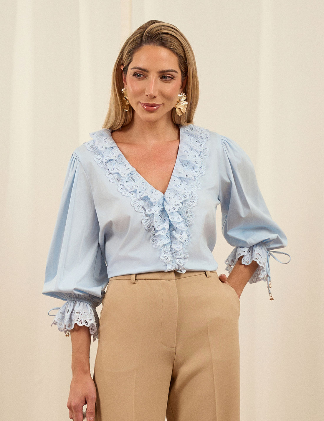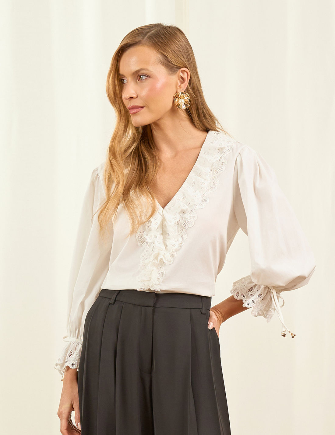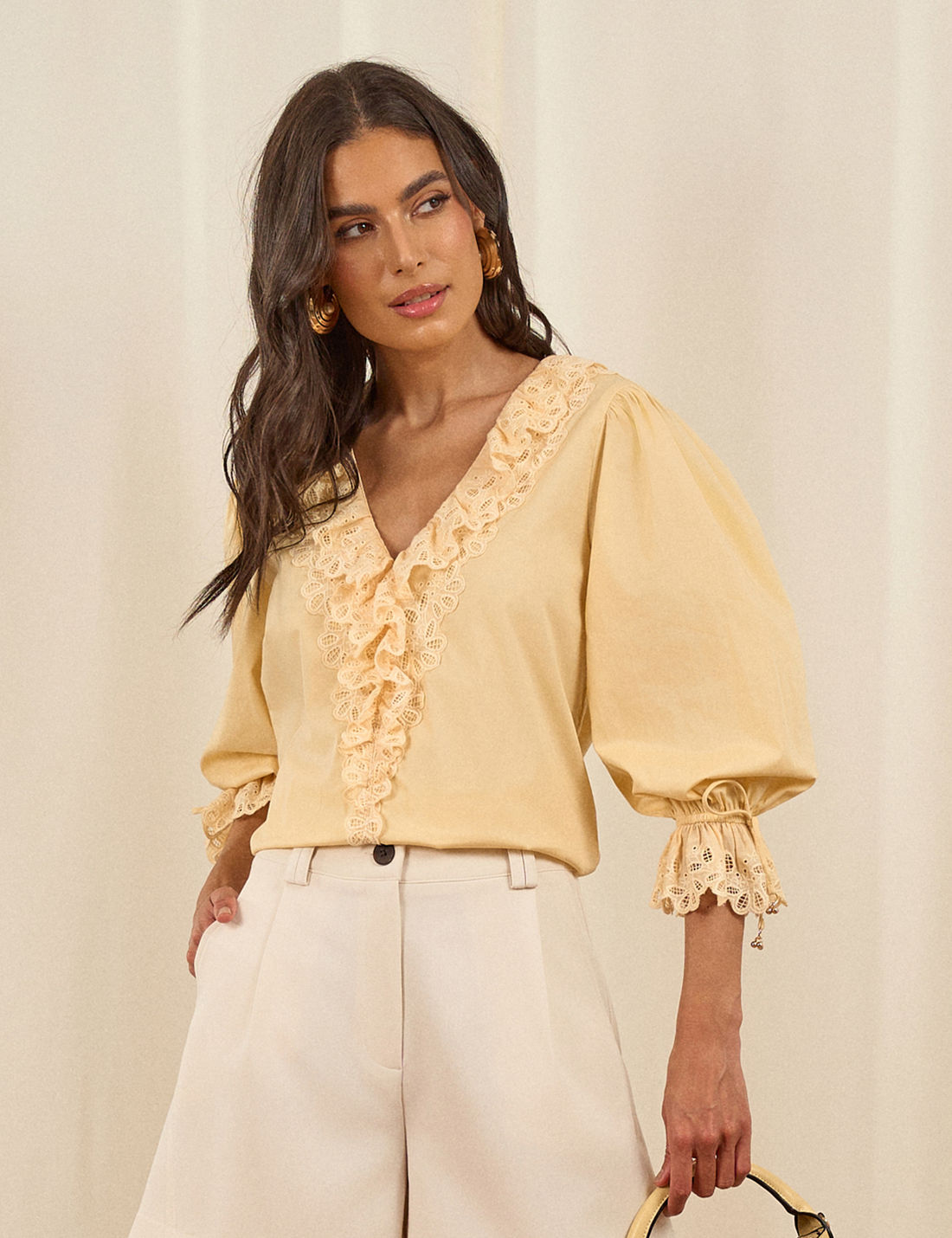 O destaque fica por conta da aplicação de laise no decote e nas mangas, finalizada com ponteiras metálicas, que acrescentam charme e sofisticação. É uma peça casual e romântica, perfeita para compor diversas produções com leveza e elegância.
