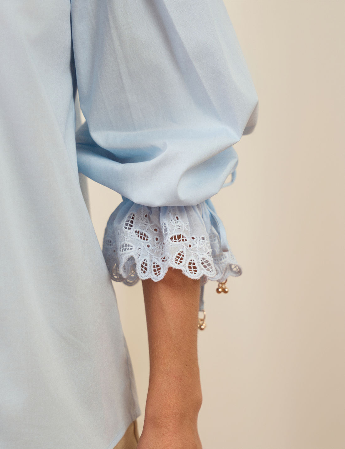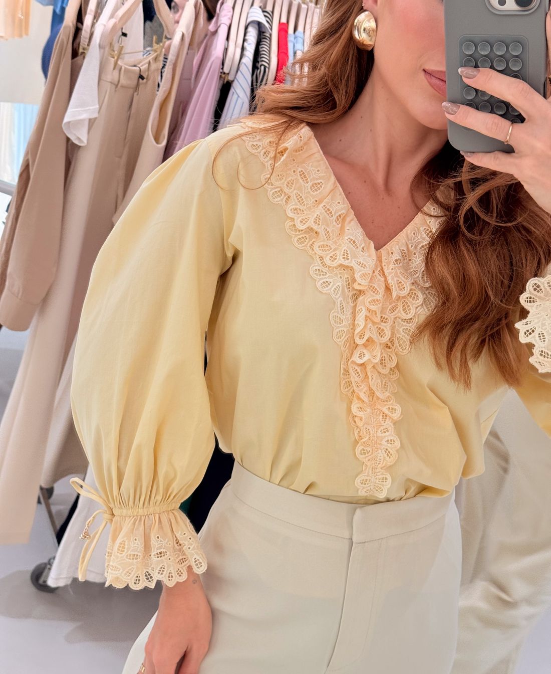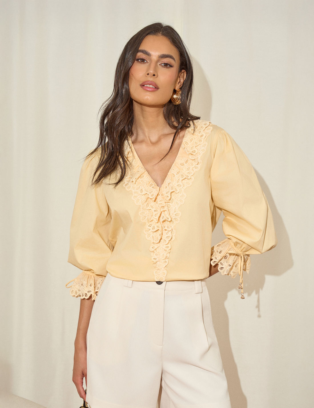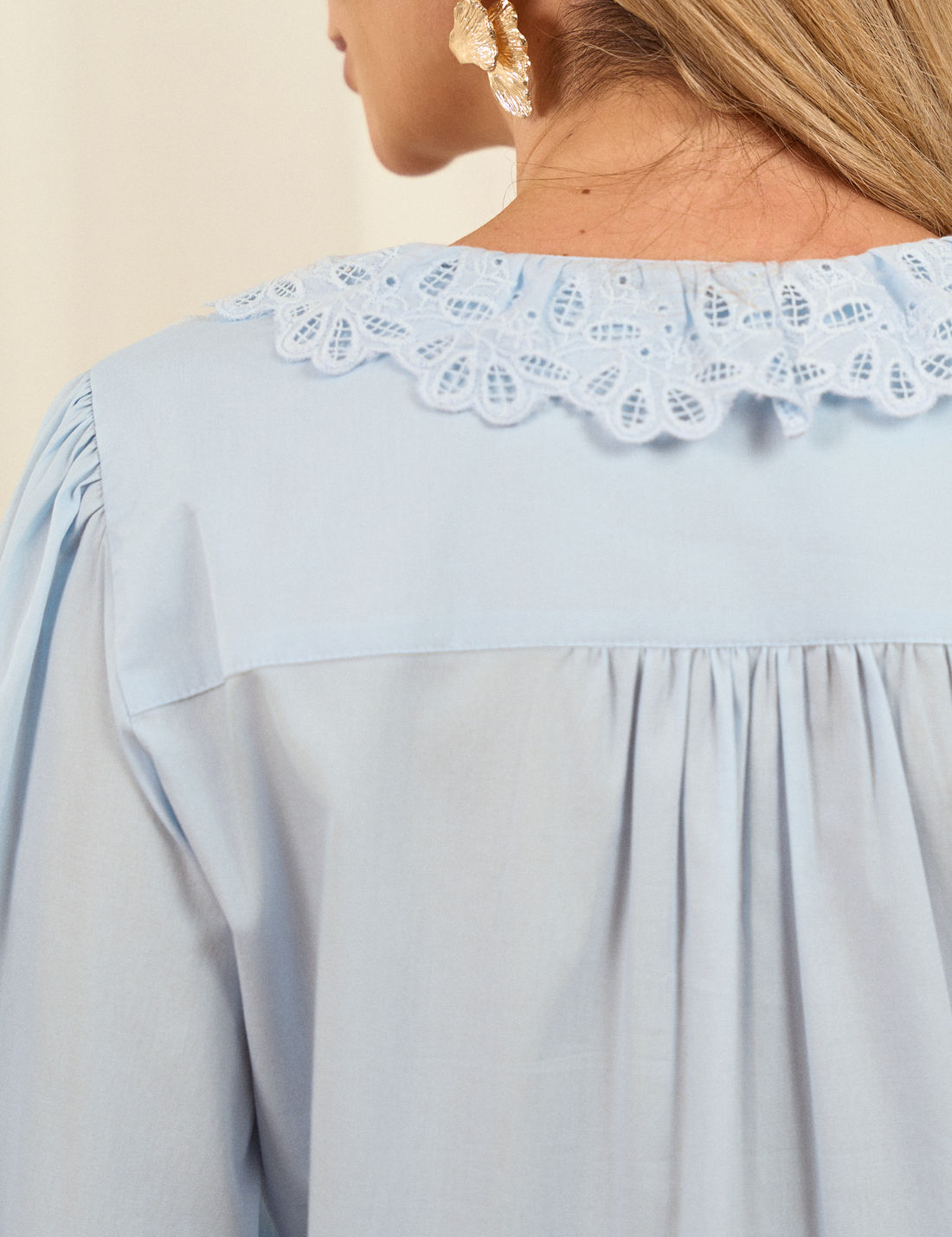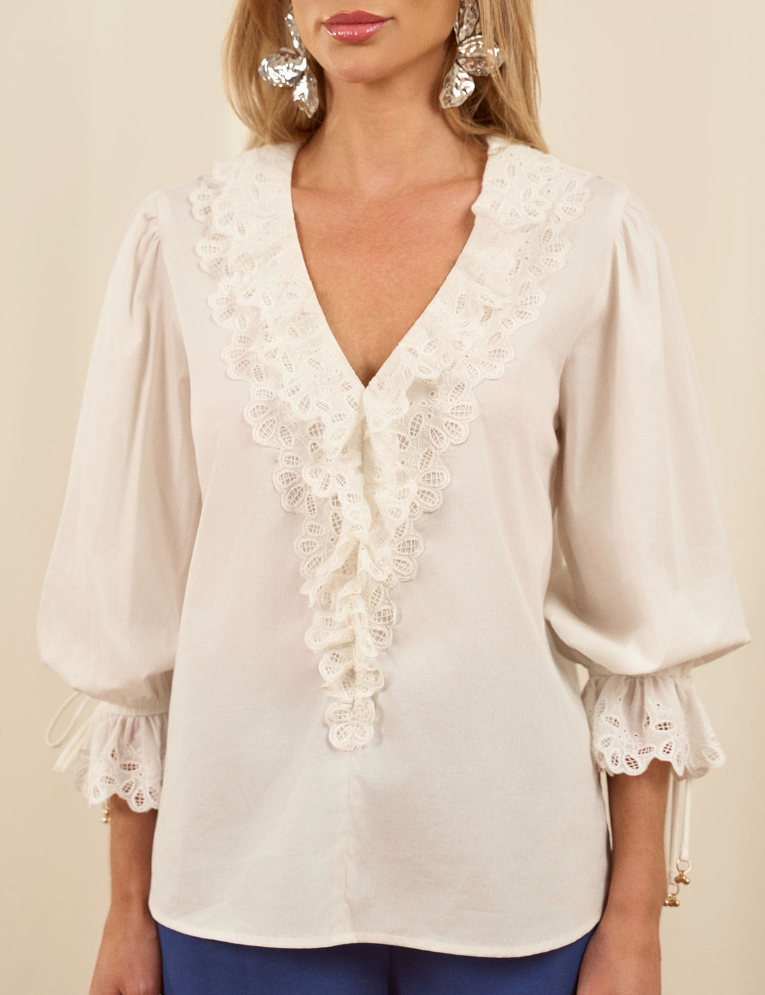 O destaque fica por conta da aplicação de laise no decote e nas mangas, finalizada com ponteiras metálicas, que acrescentam charme e sofisticação. É uma peça casual e romântica, perfeita para compor diversas produções com leveza e elegância.