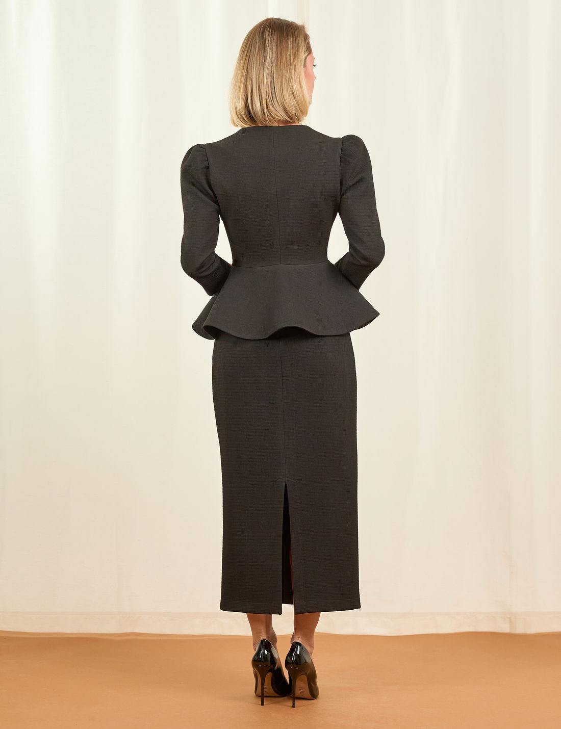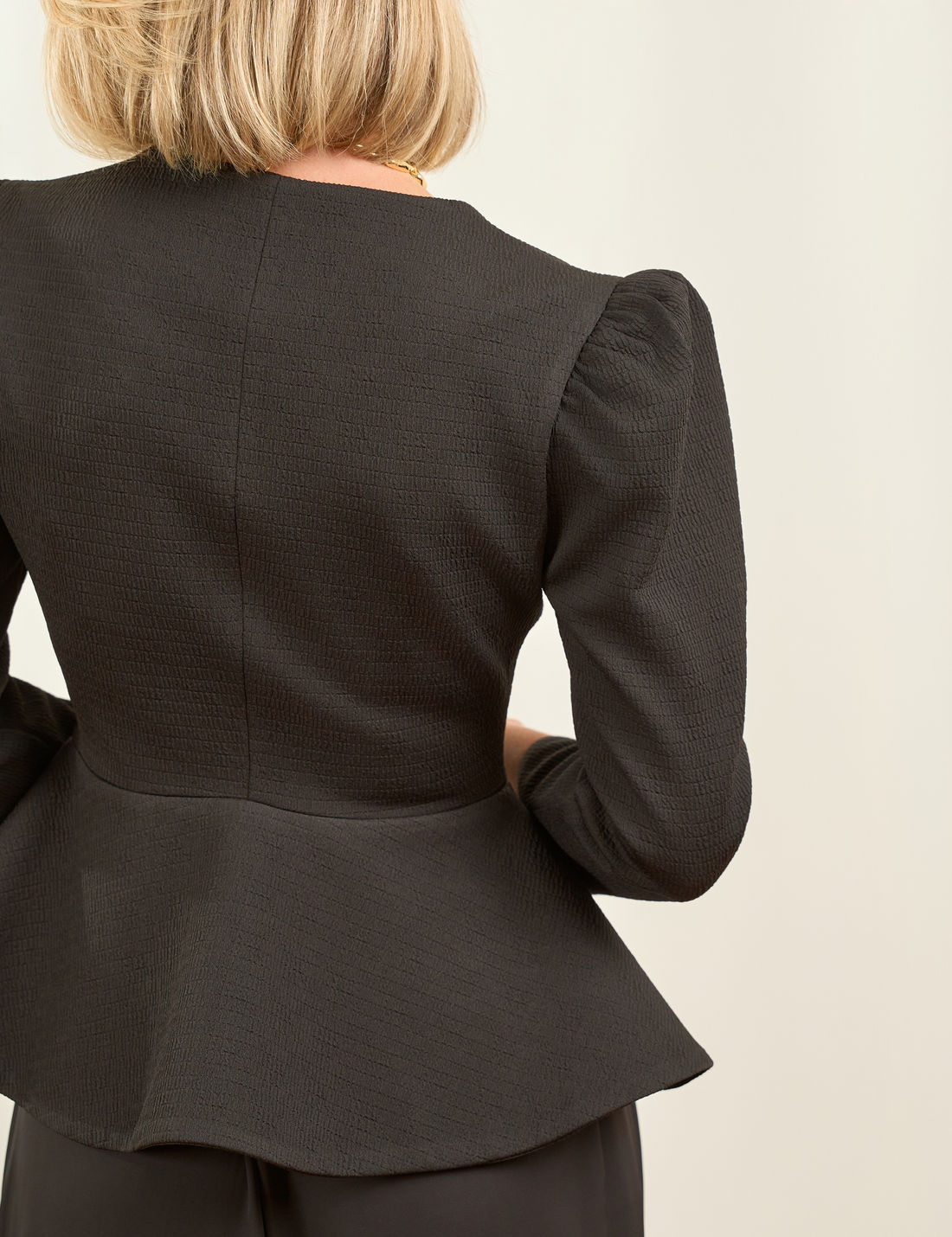 A modelagem peplum confere charme e movimento, enquanto o abotoamento frontal com botões forrados e o fechamento interno por colchete garantem segurança e conforto ao vestir.