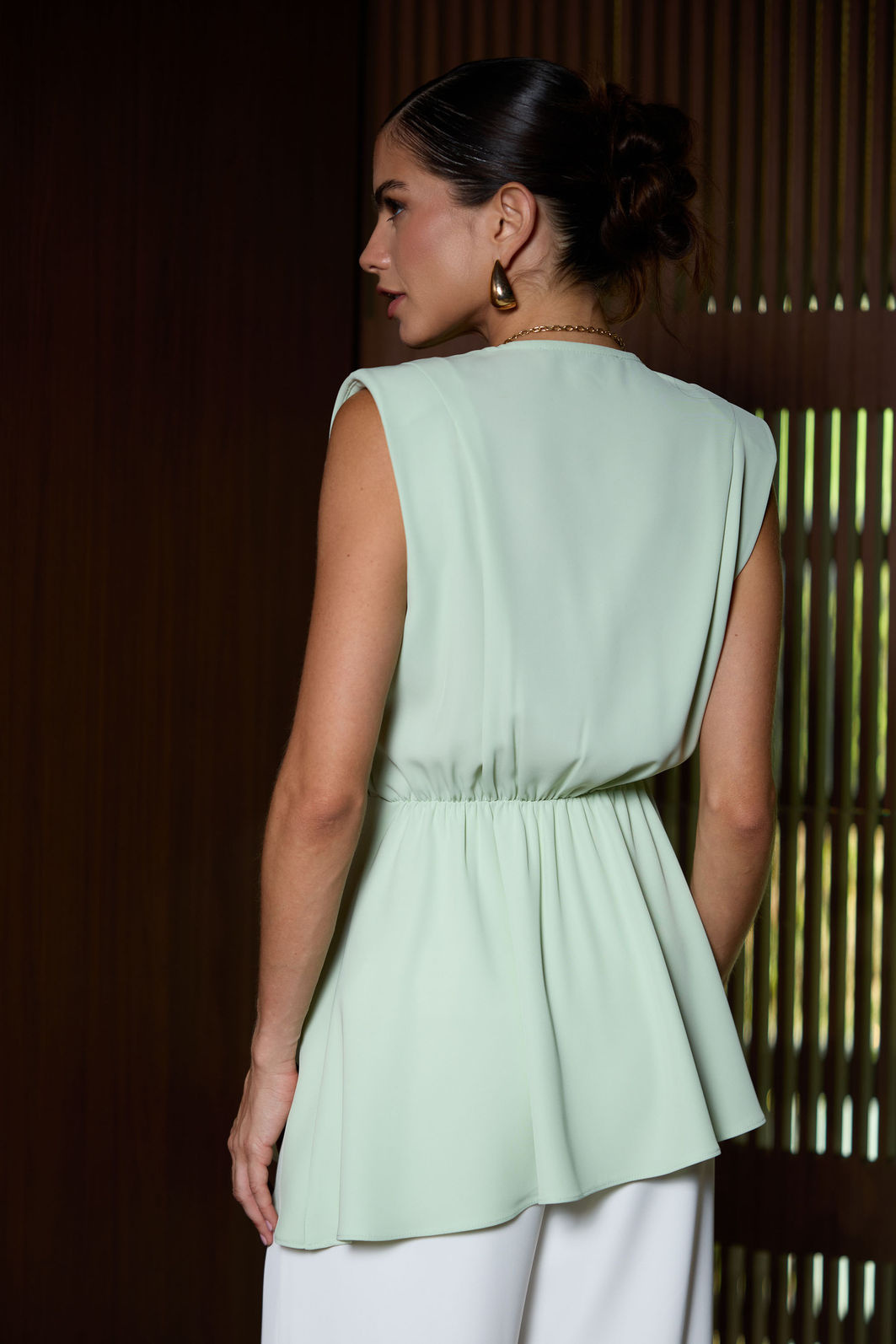 Possui decote transpassado, sem mangas, pregas frontais e posteriores e ombreiras internas, que estruturam o visual com sofisticação.