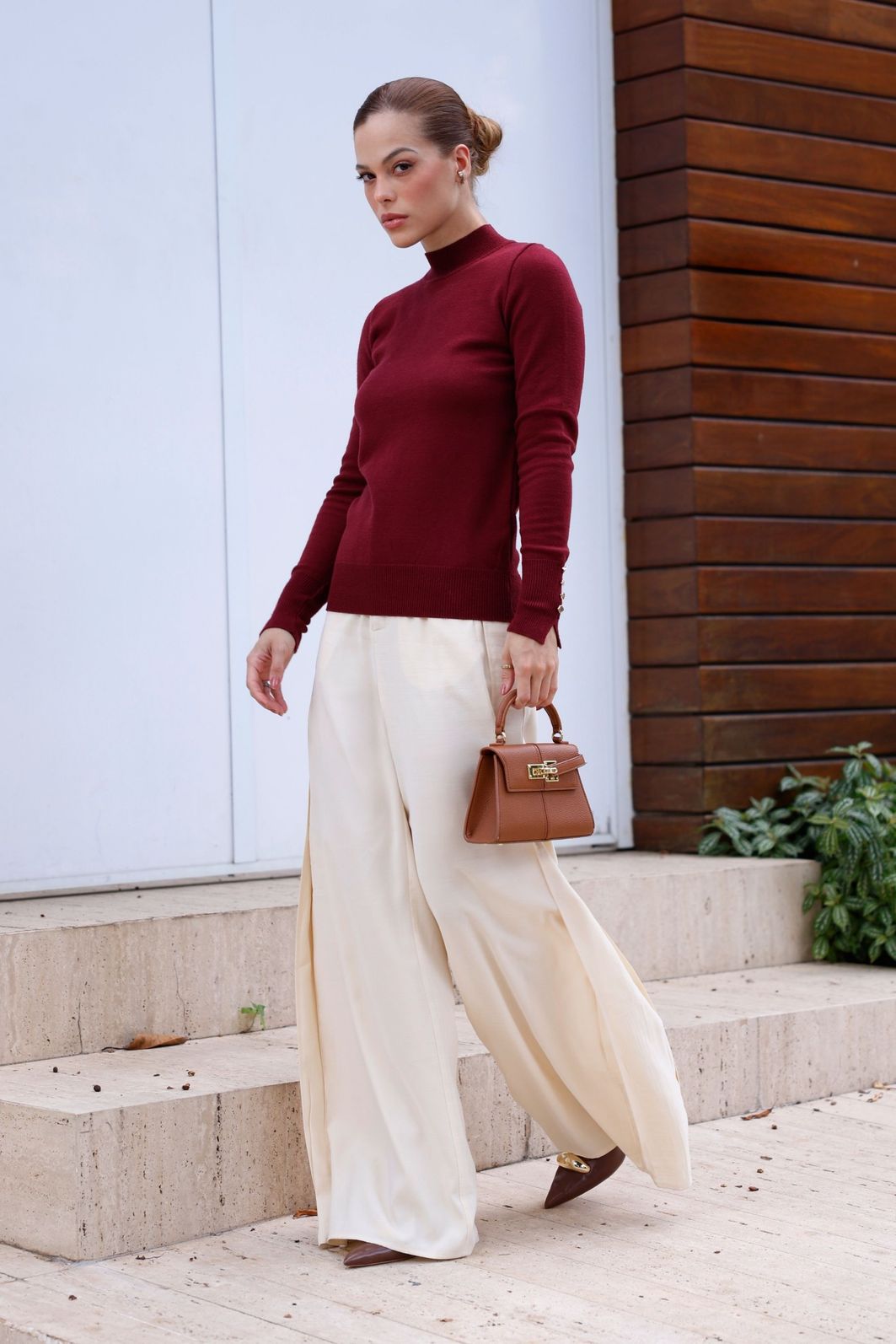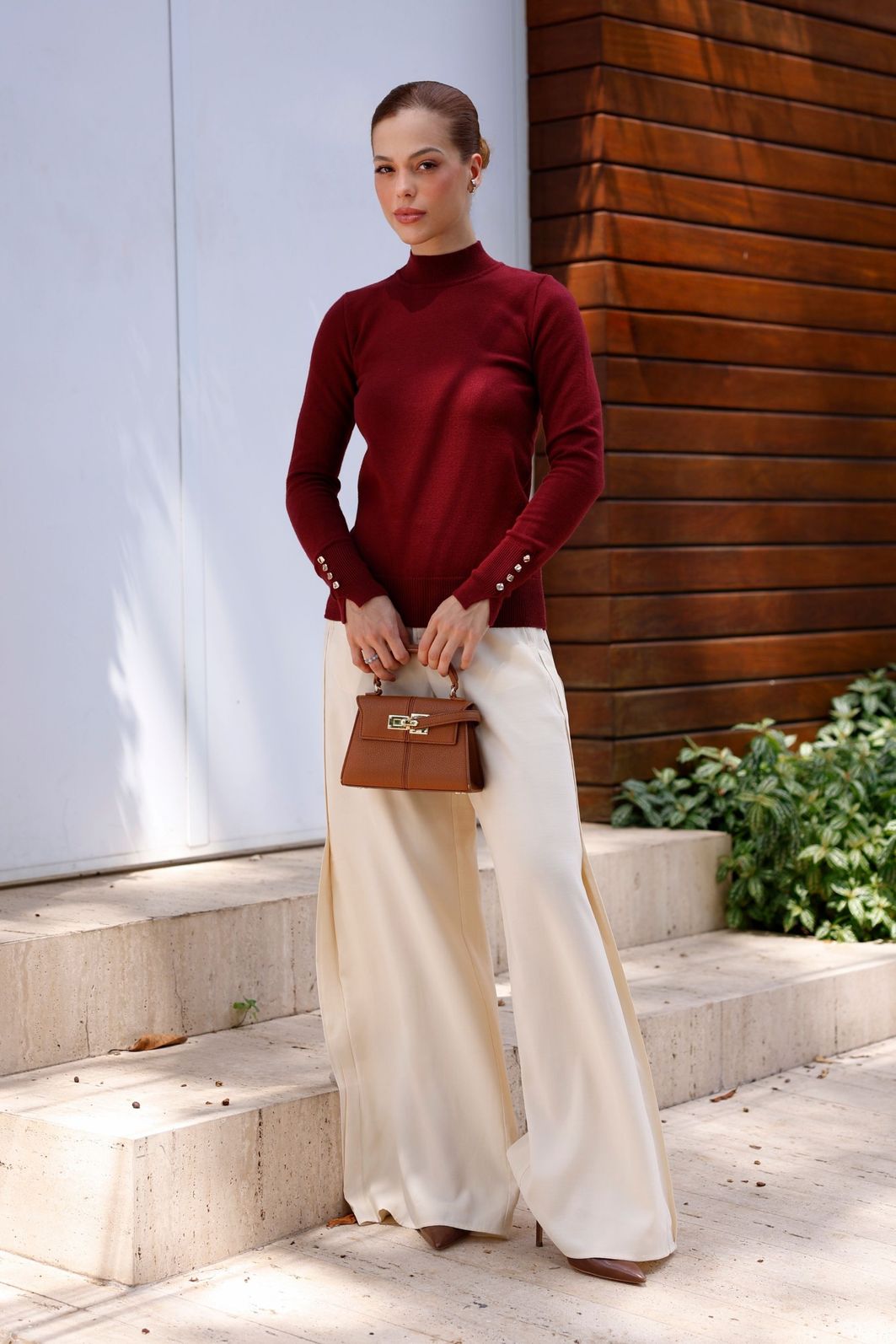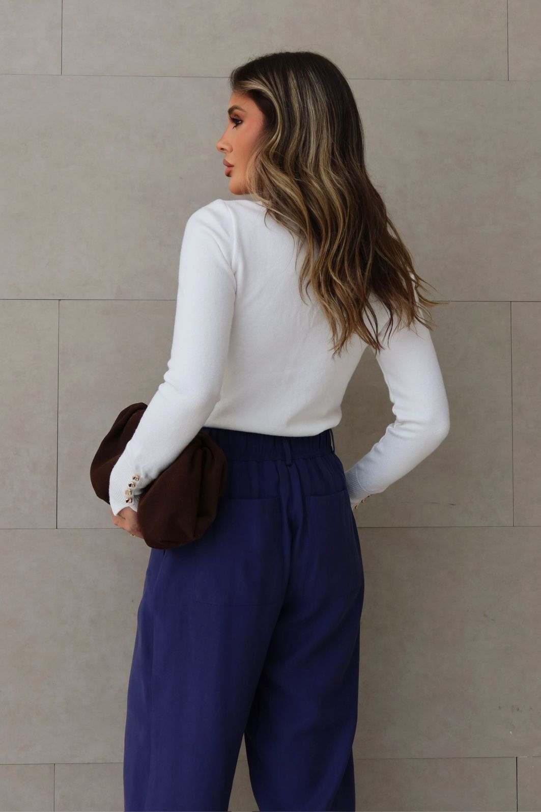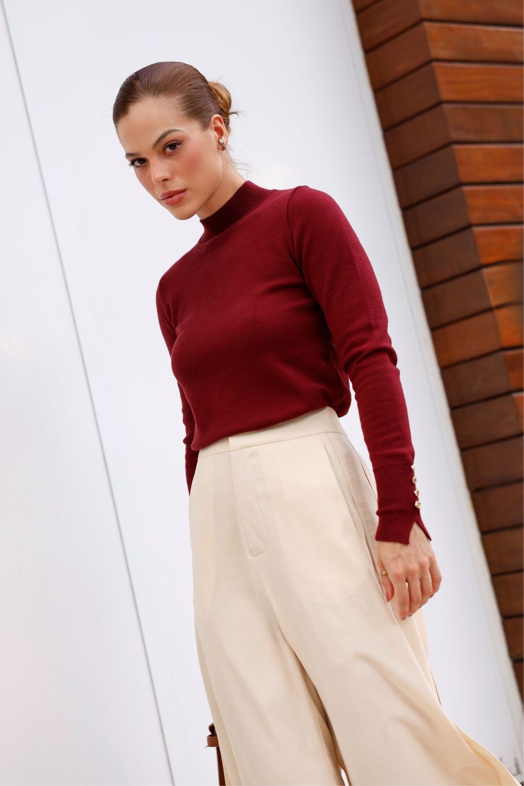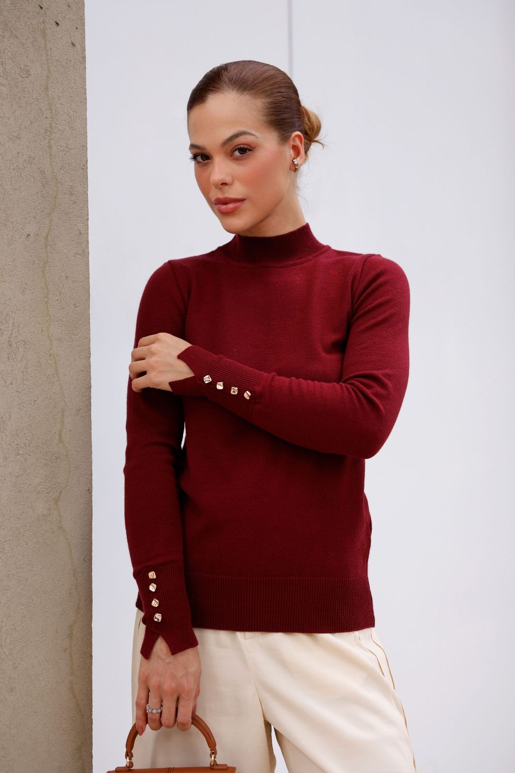 Blusa em tricot com botões no punho une conforto e elegância em uma peça atemporal. Com textura macia e agradável ao toque, proporciona bem-estar durante todo o uso.