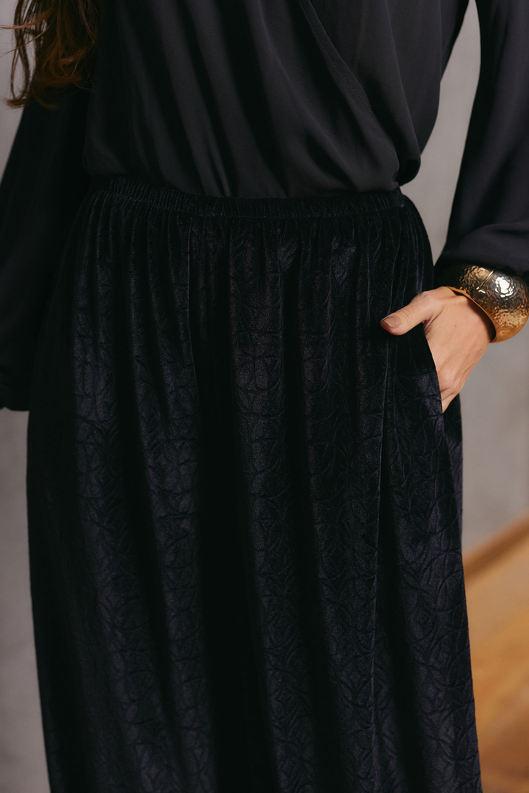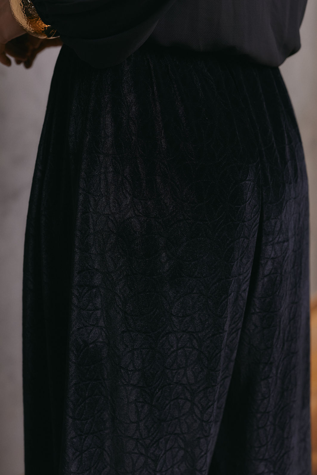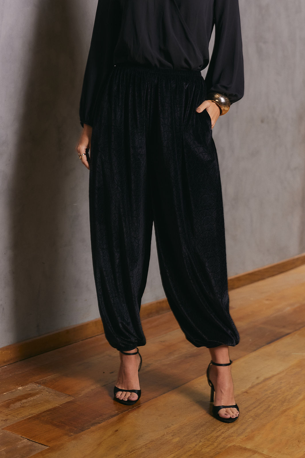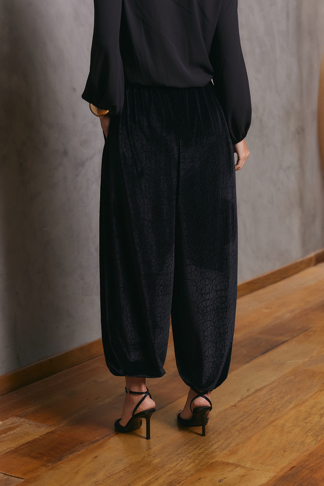 A calça em veludo jacquard une conforto e sofisticação em uma peça moderna e versátil.