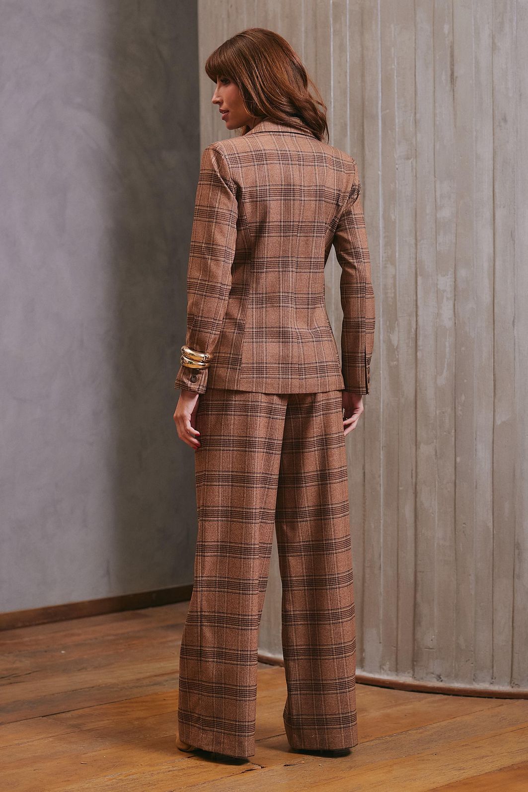 Calça Feminina em Alfaiataria Xadrez é uma peça elegante e atemporal que traz sofisticação ao visual. Confeccionada em tecido de alfaiataria, possui caimento estruturado que valoriza a silhueta e garante conforto ao longo do dia.