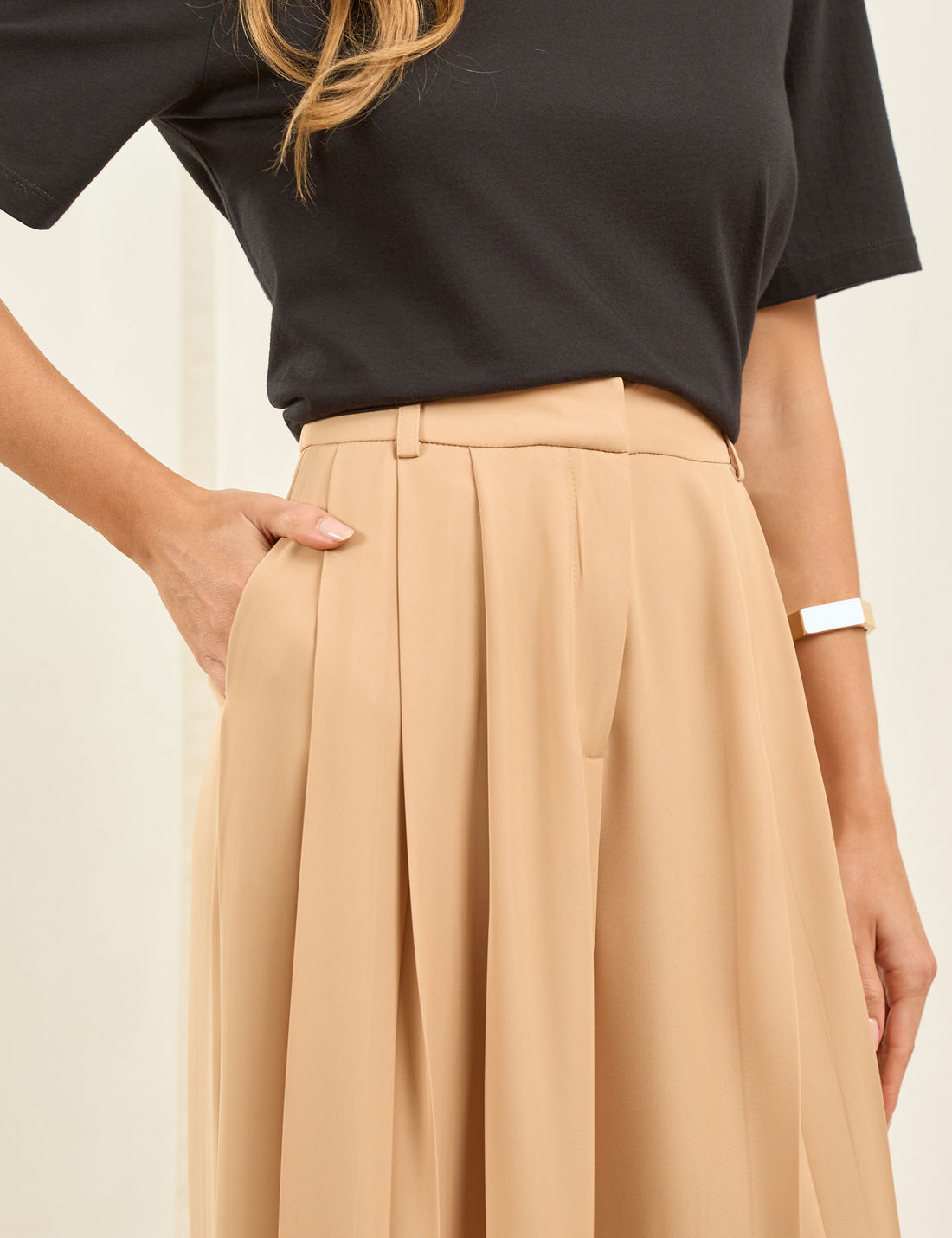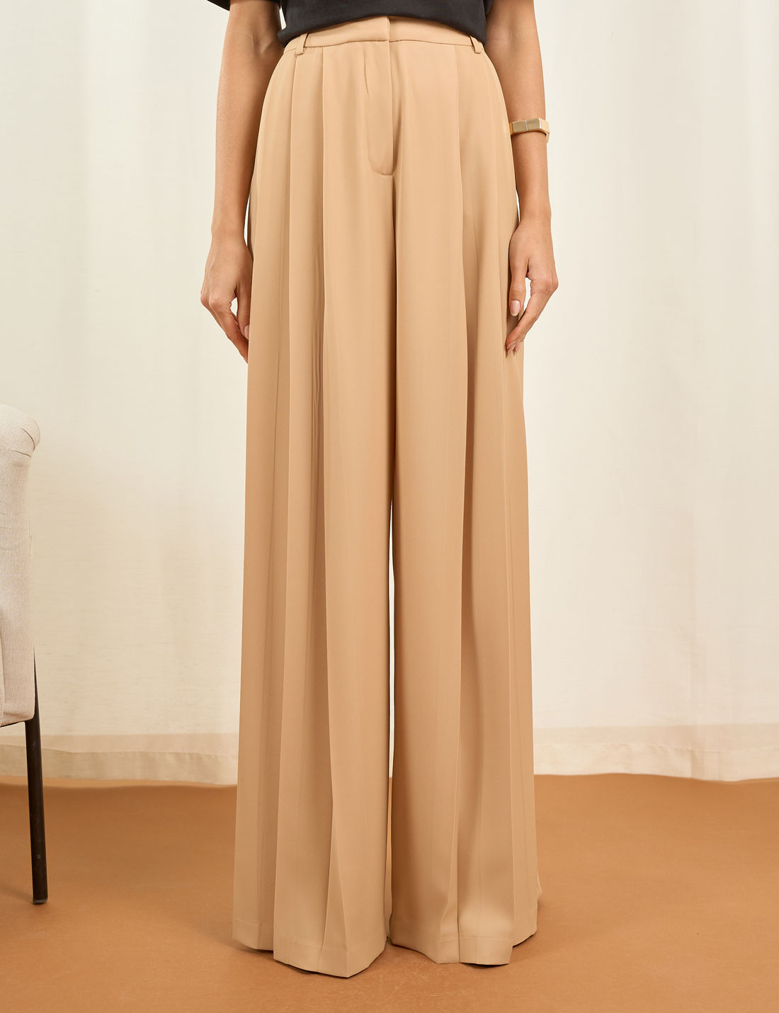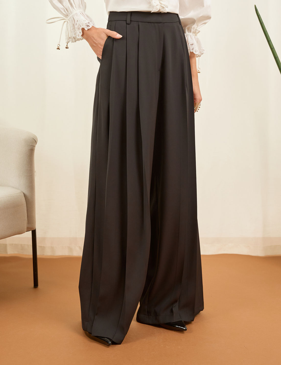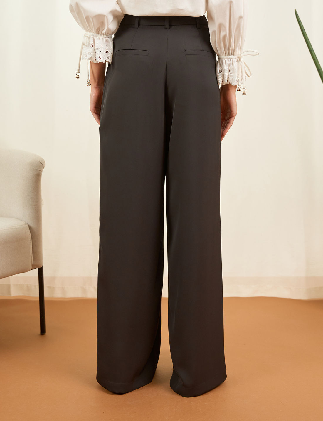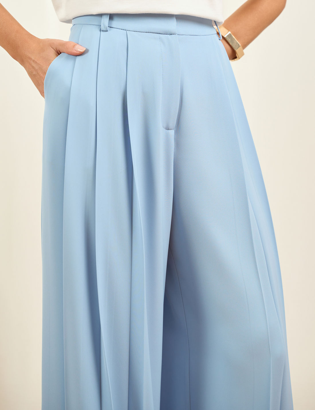 Conta com bolsos laterais funcionais, pregas duplas que adicionam elegância ao design e bolsos embutidos posteriores, que reforçam o acabamento refinado. O fechamento frontal é feito por zíper, fecho social e botão interno de segurança, assegurando praticidade e discrição.