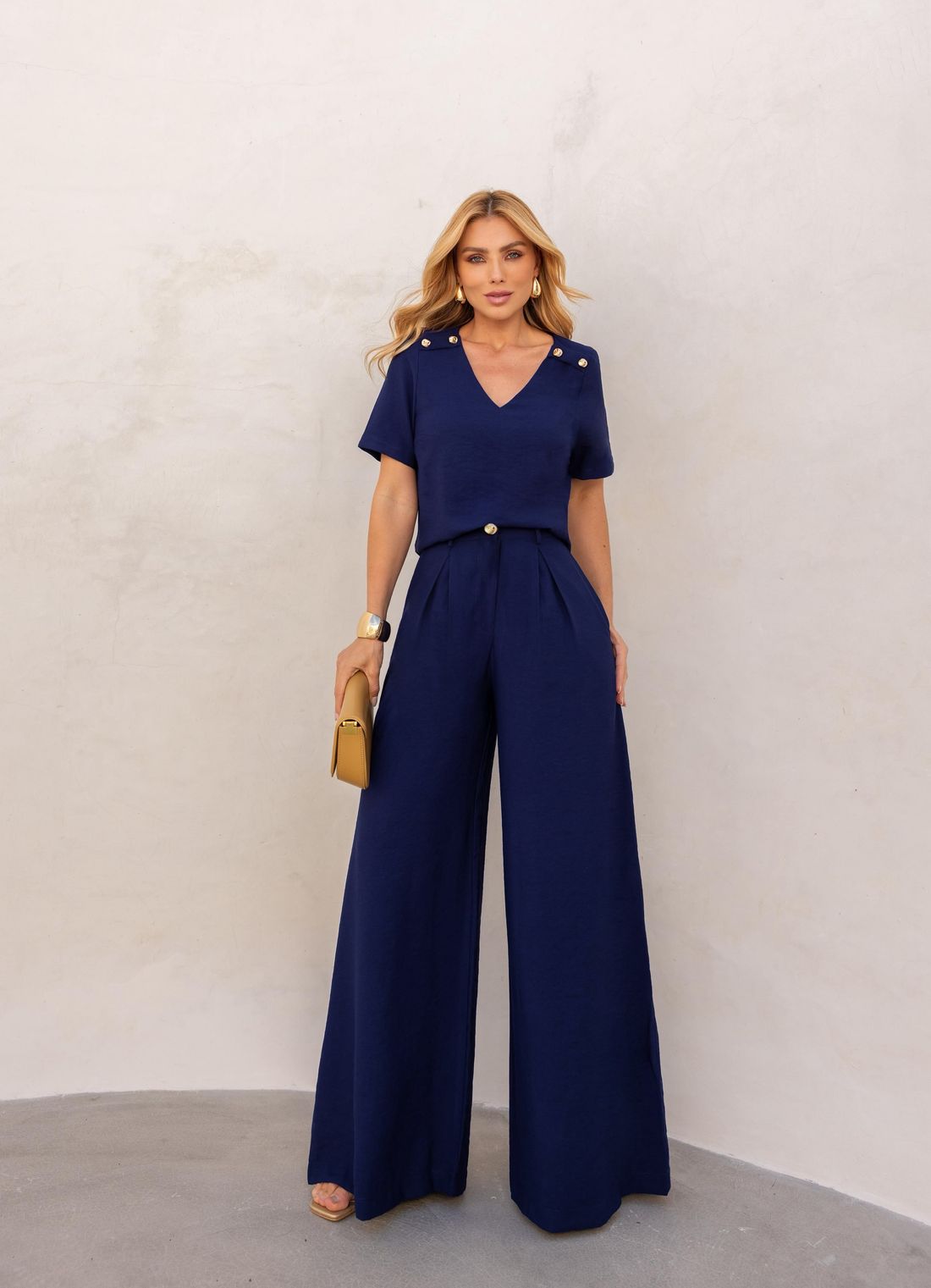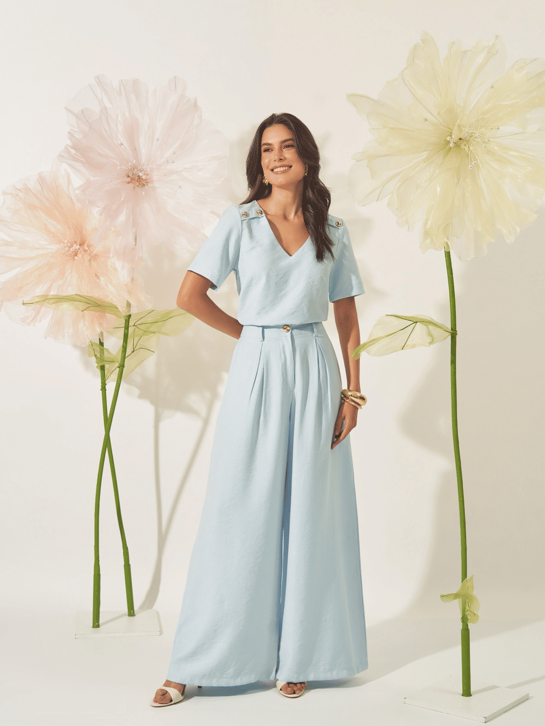 A modelagem ampla alonga a silhueta e traz fluidez ao look, enquanto o tecido com toque macio garante conforto ao longo do dia. Perfeita para composições modernas no trabalho ou em ocasiões especiais.