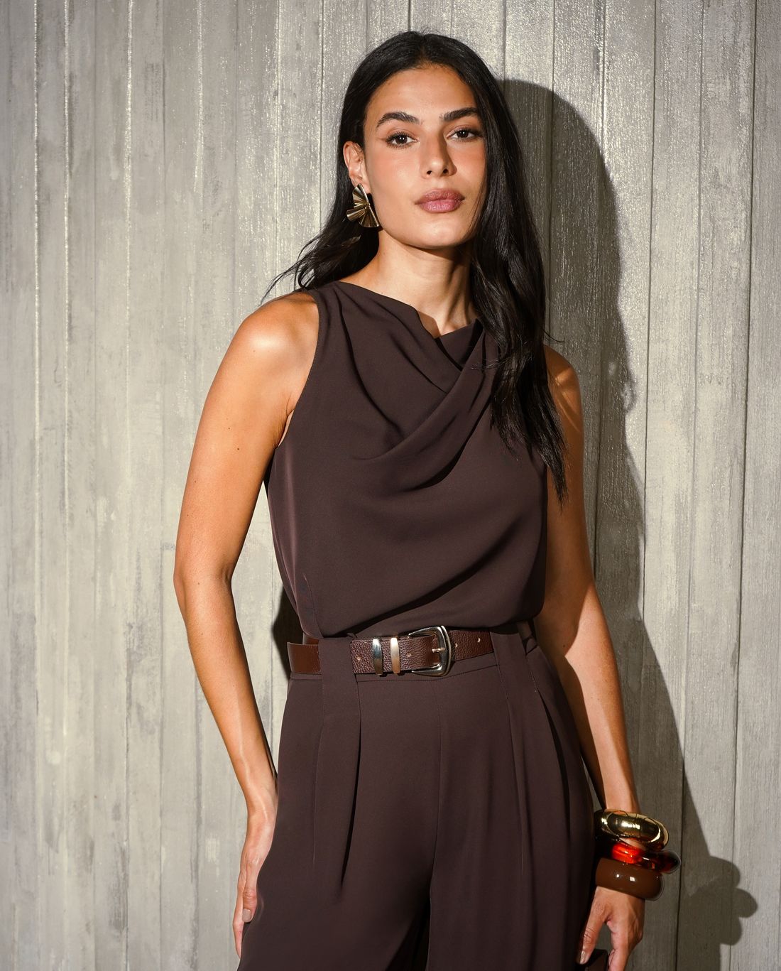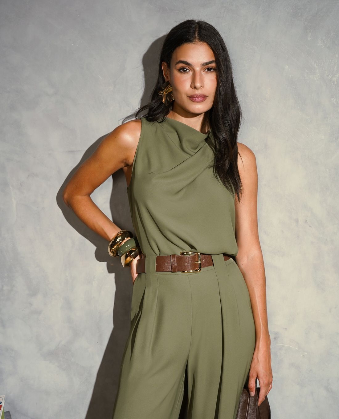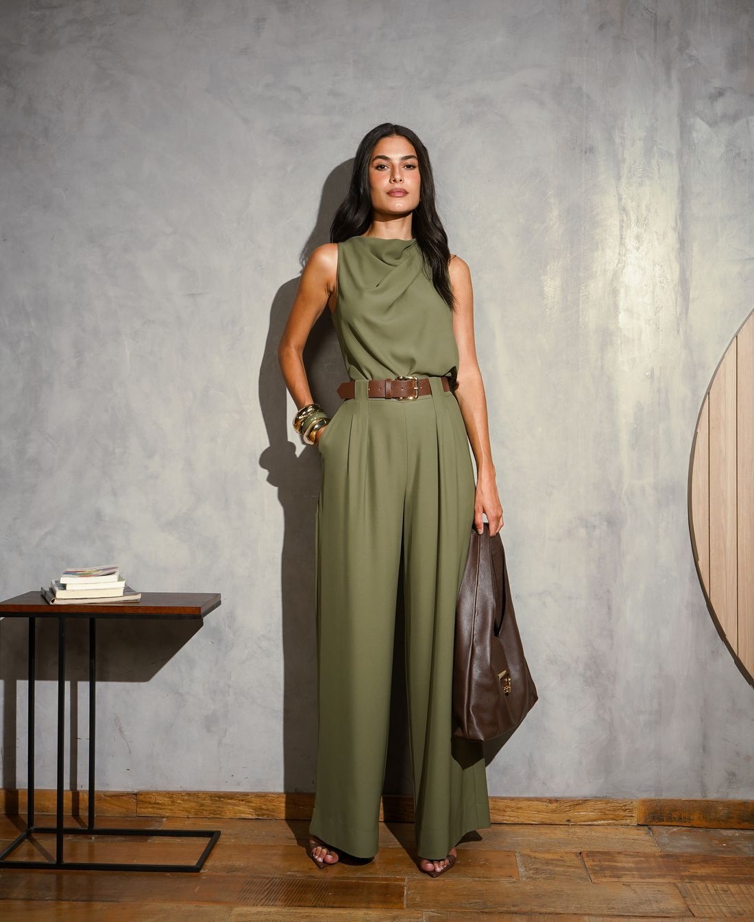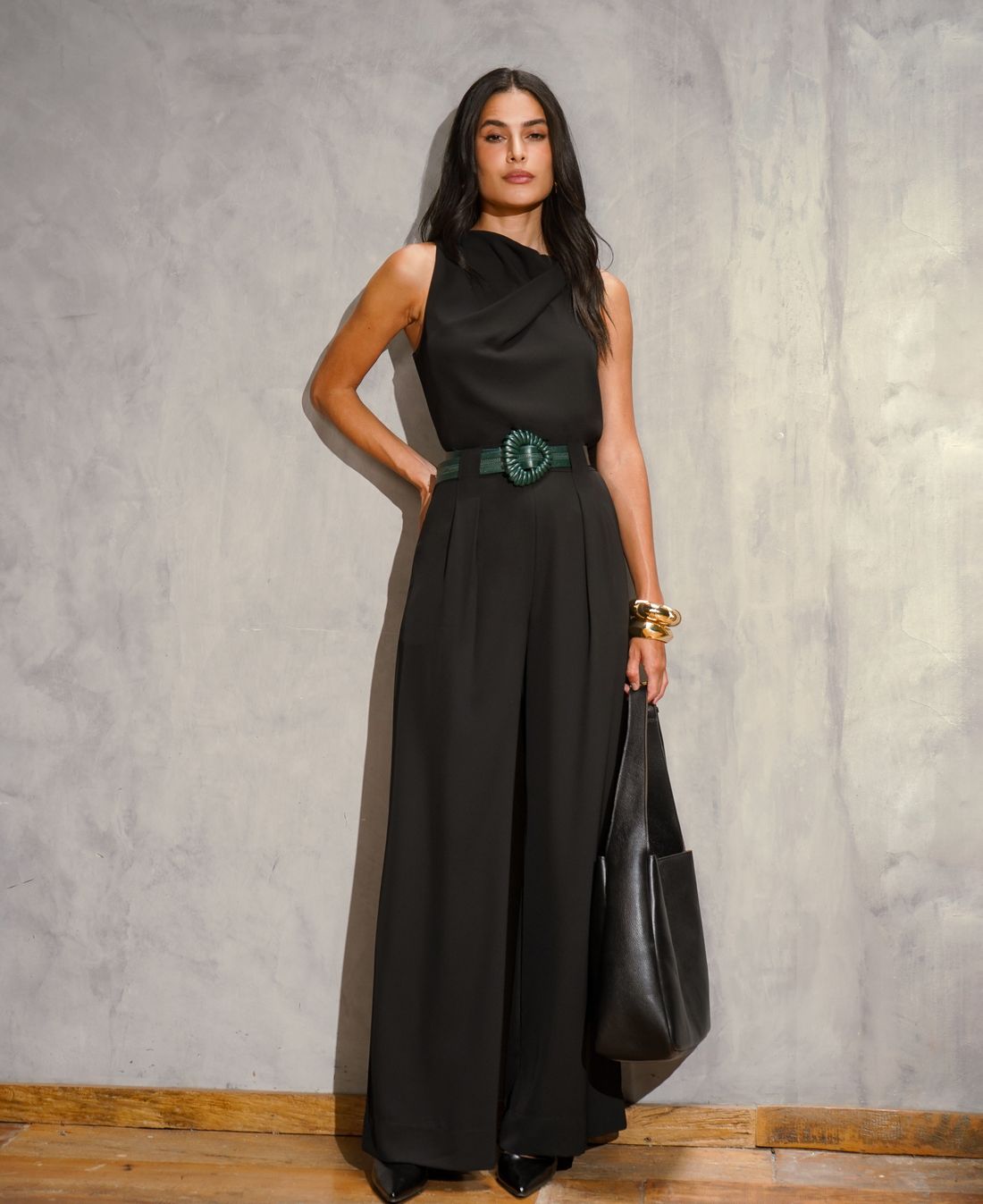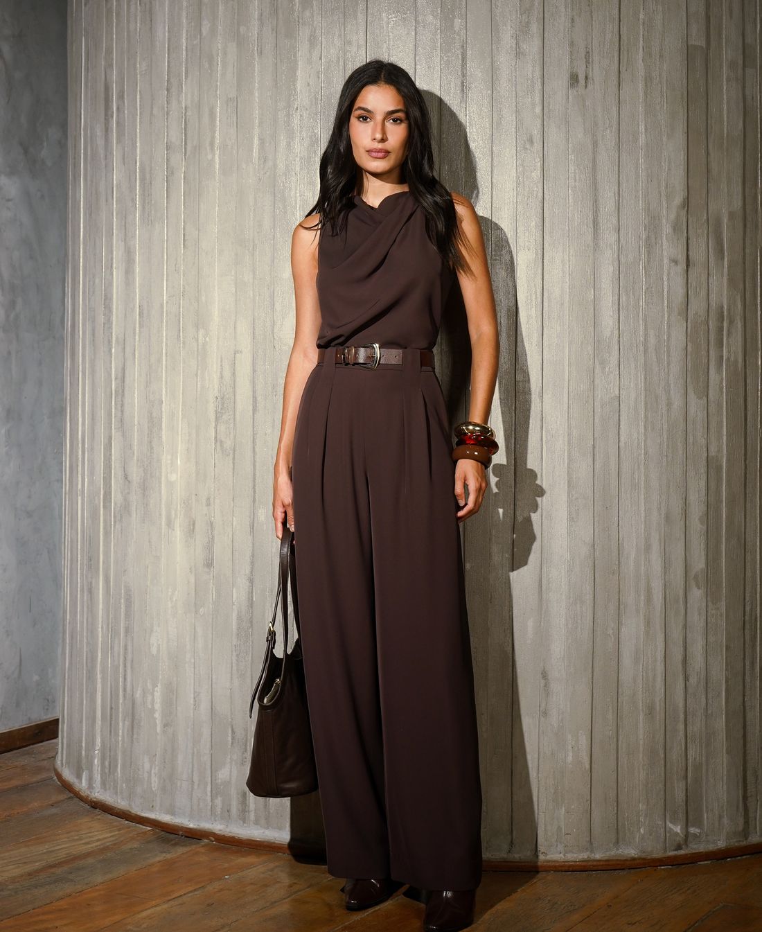 A modelagem ampla cria um visual alongado e sofisticado, ideal para produções modernas que equilibram formalidade e leveza.