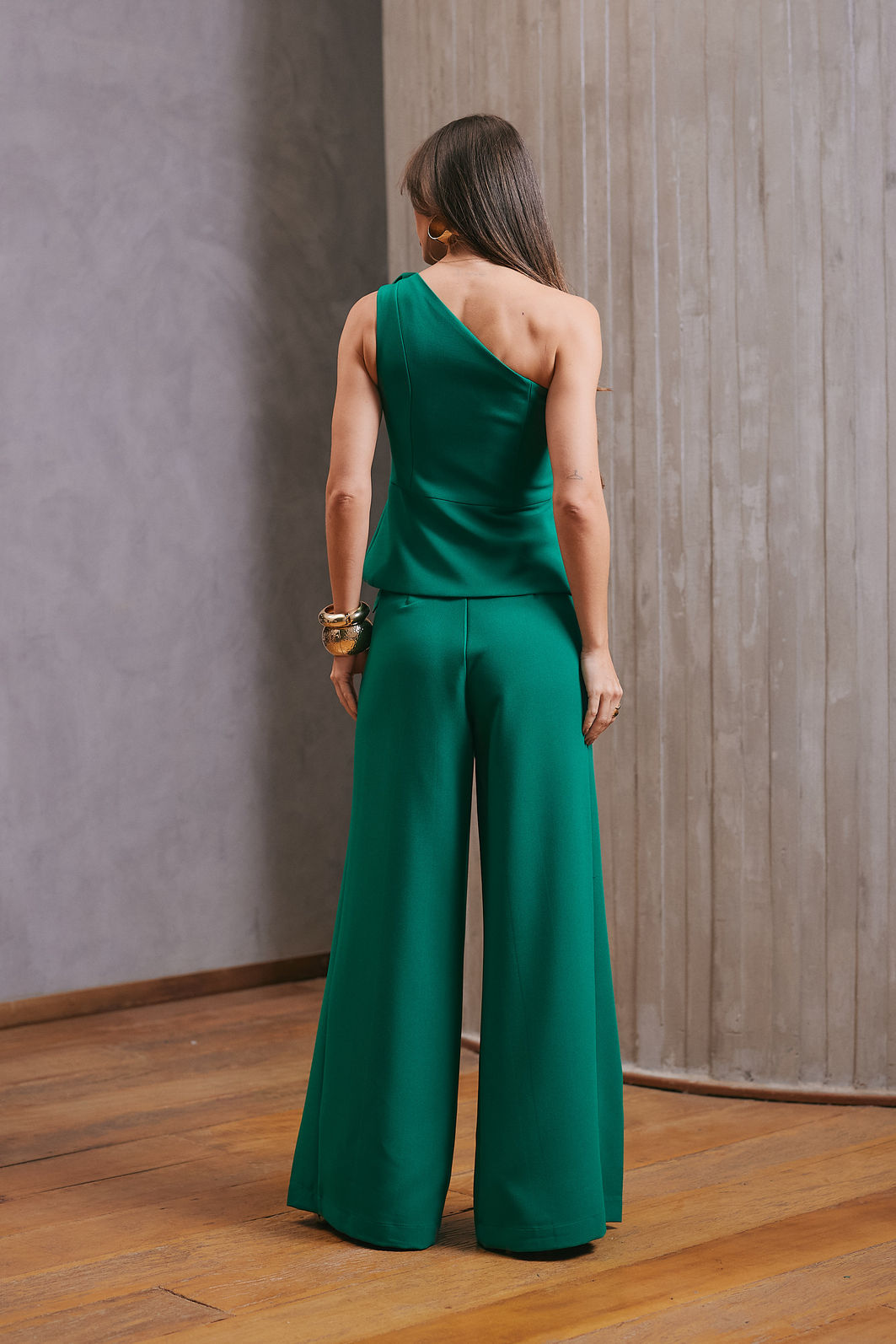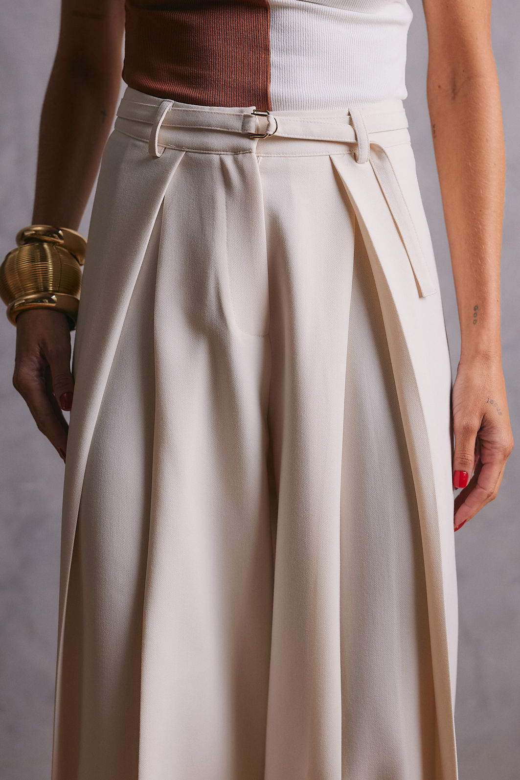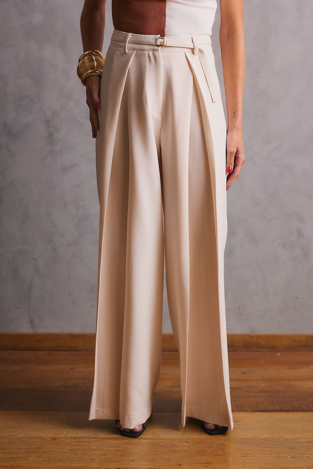 Calça confeccionada em tecido plano, com modelagem de alfaiataria que garante caimento encorpado e sofisticado.