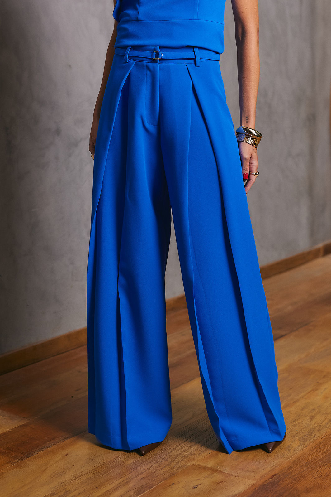 Acompanha cinto do próprio tecido, finalizado com fivela dupla de metal, que acrescenta um toque moderno ao design.