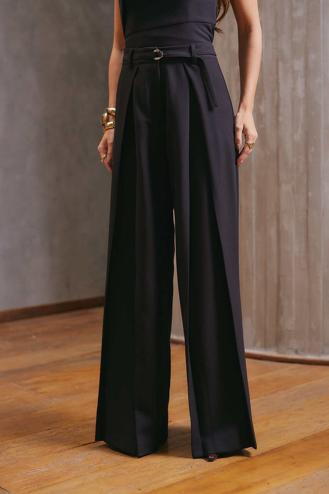 Possui pregas frontais e pence posterior, que valorizam a silhueta com elegância.