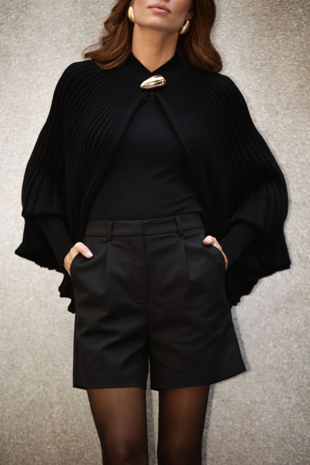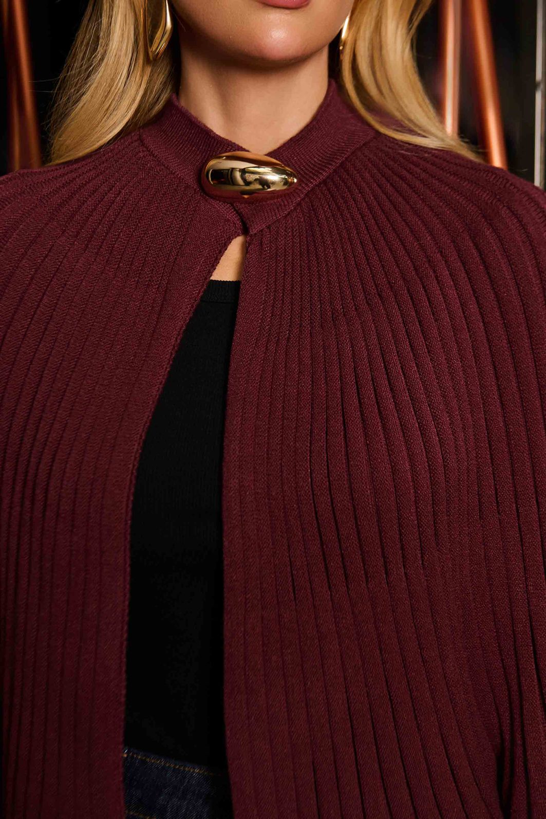 O grande destaque da peça é o broche dourado, que funciona como fechamento e elemento de estilo, valorizando o look com um toque moderno e refinado.