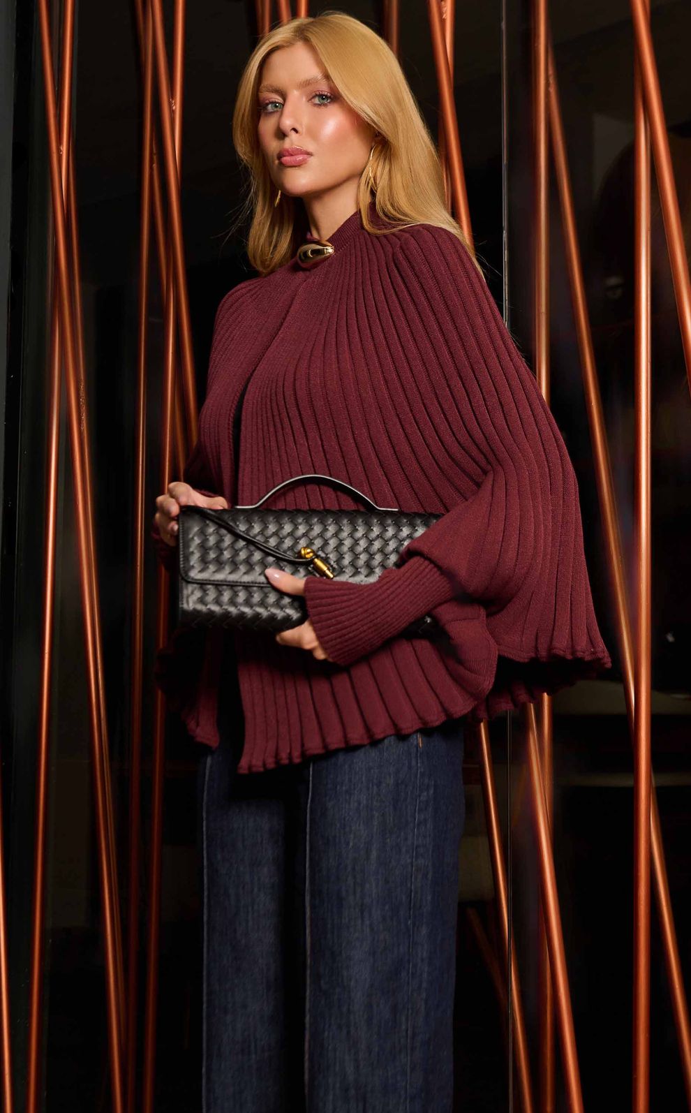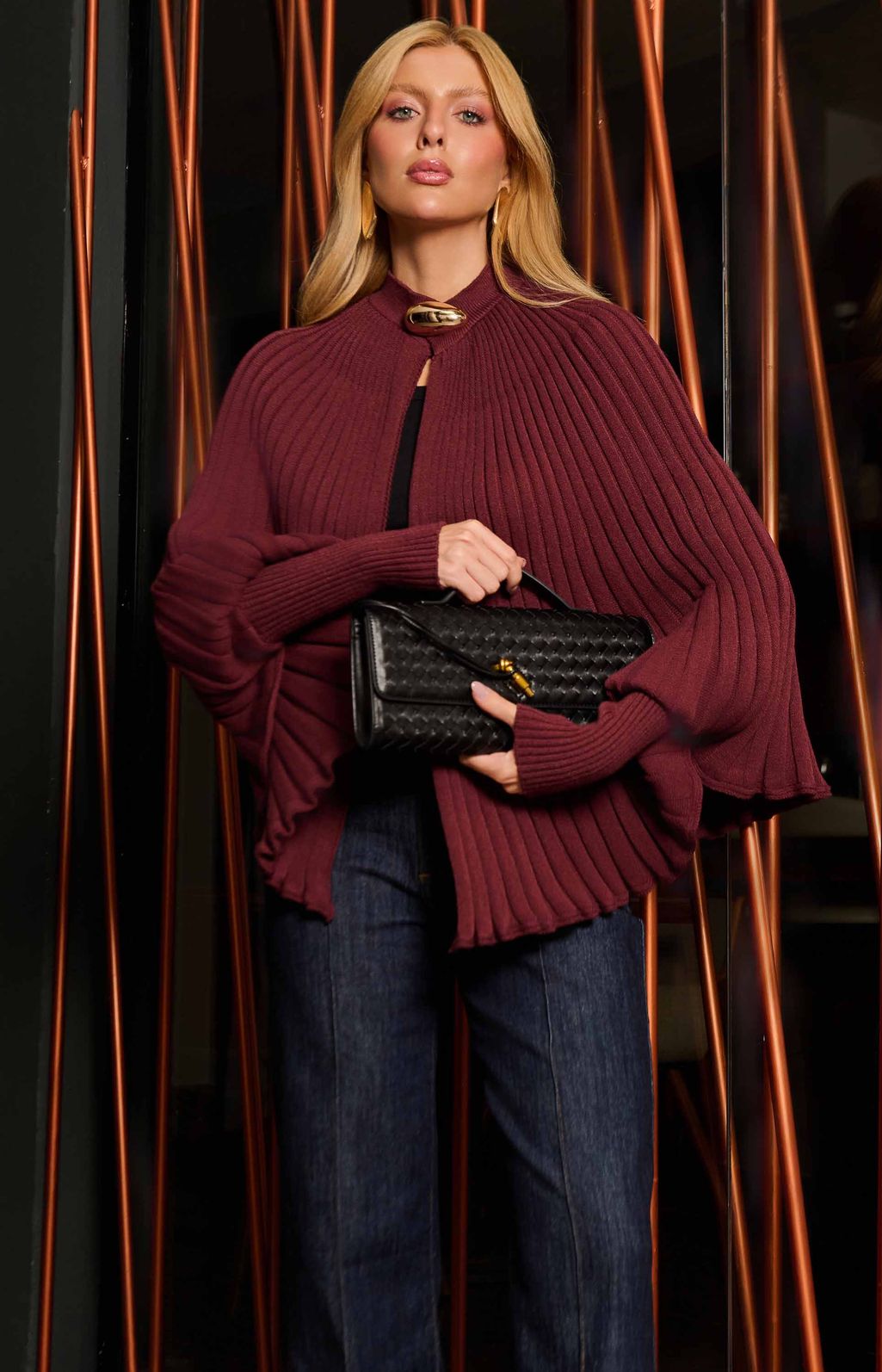 Com design diferenciado, possui modelagem ampla com efeito de capa e acabamento canelado que traz textura e movimento ao visual.