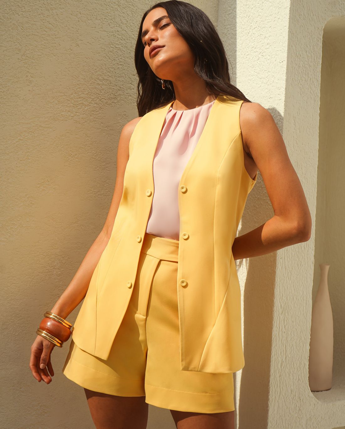 Colete Boy em Alfaiataria Mista traz a elegância da alfaiataria com uma pegada moderna e cheia de personalidade.