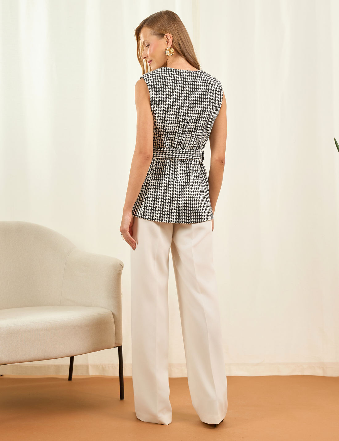 AdicionarColete confeccionado em tweed, com caimento estruturado que transmite elegância e modernidade ao visual. Apresenta decote arredondado, sem mangas e lapela frontal, além de recortes posteriores que valorizam o design. O abotoamento frontal é feito com botões forrados, enquanto o cinto com fivela revestida no mesmo tecido adiciona um toque de refinamento. Versátil e atemporal, é a peça ideal para compor produções casuais ou elegantes com estilo e sofisticação.