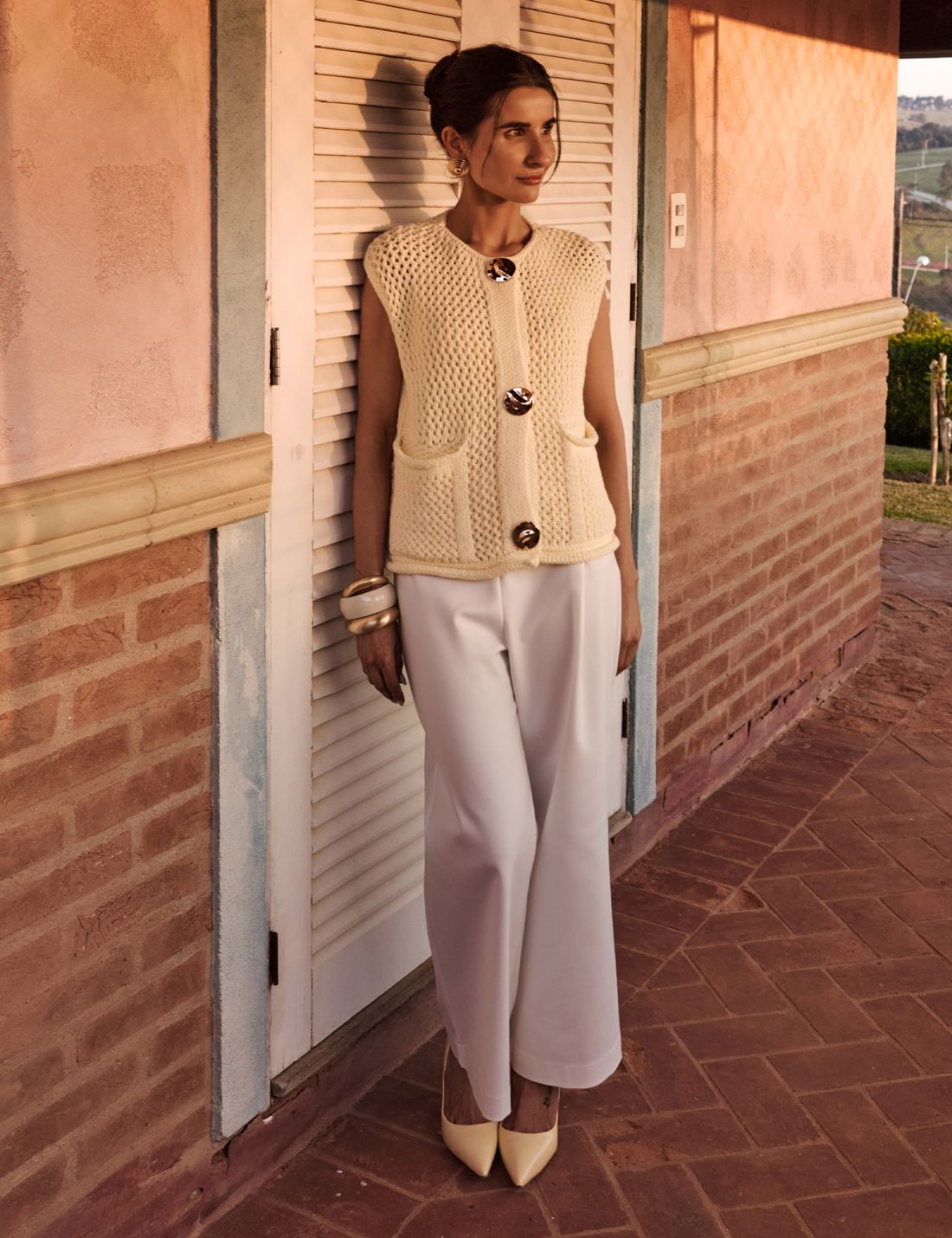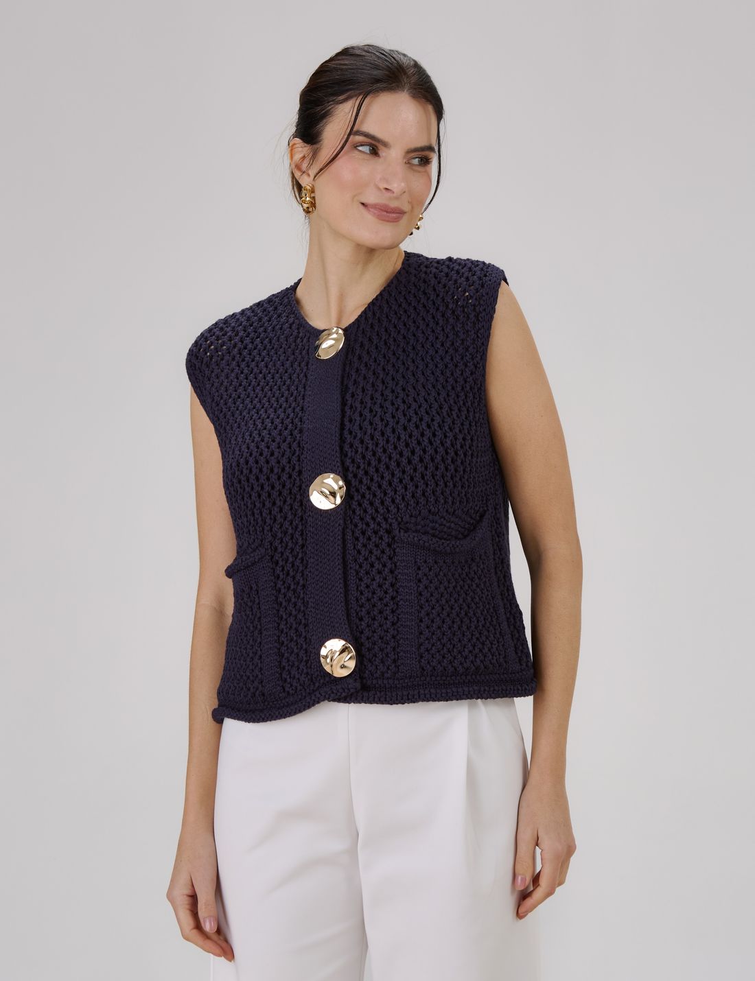 Colete confeccionado em acrílico com elastano, combinando maciez e conforto para um caimento impecável. Apresenta decote arredondado, sem mangas, e bolsos frontais funcionais que unem praticidade e estilo.