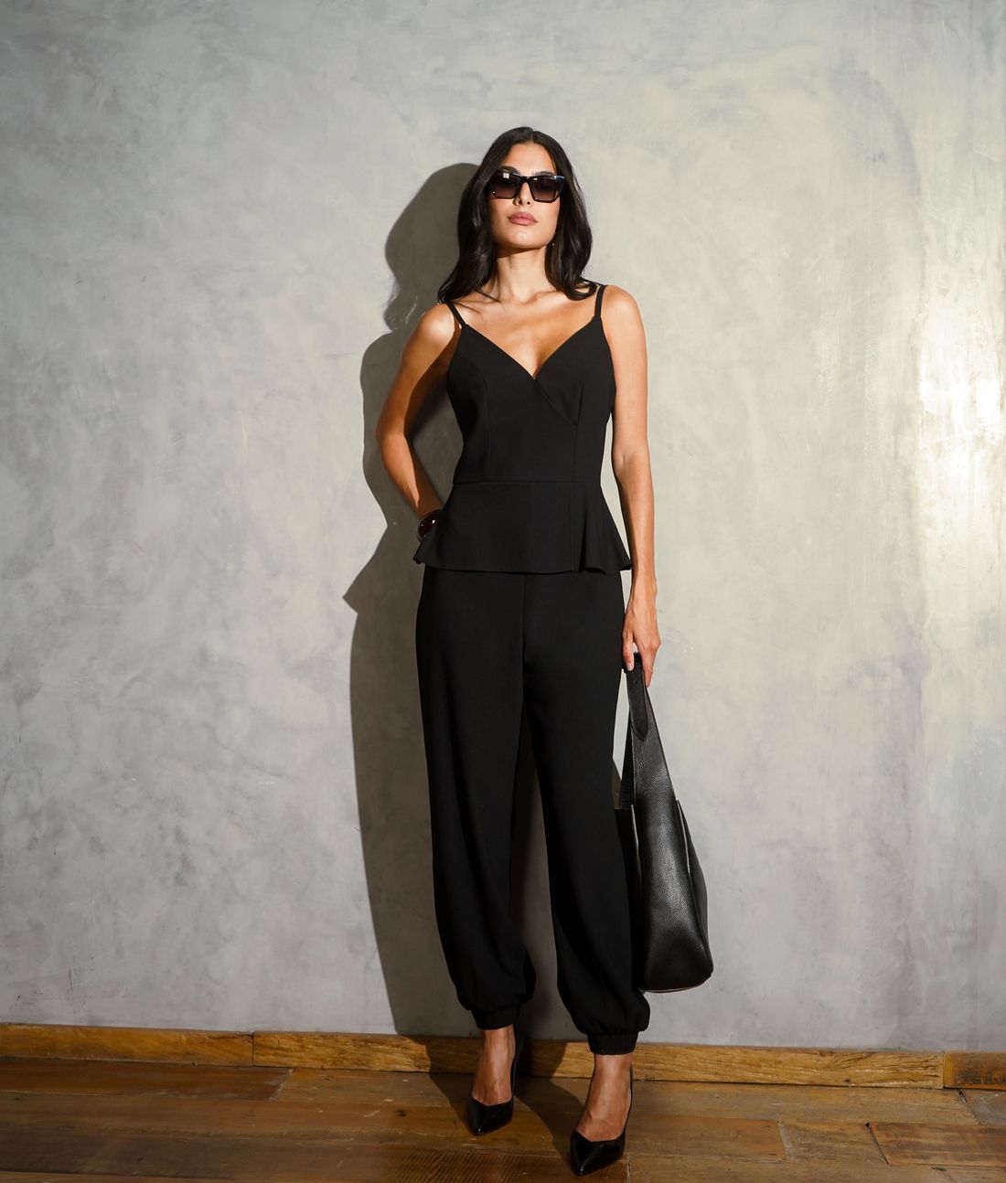 O macacão harem em crepe encorpado é a peça ideal para quem busca elegância sem abrir mão da praticidade.