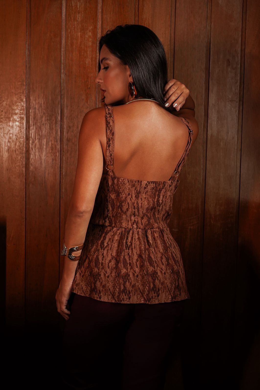 A estampa cobra em tons neutros garante versatilidade e um visual atual, fácil de combinar em produções do dia à noite.