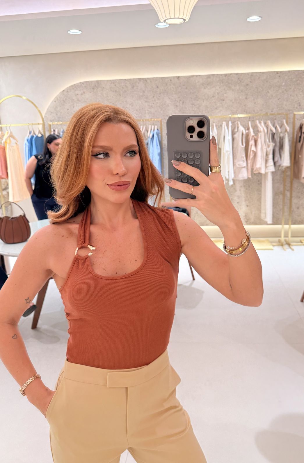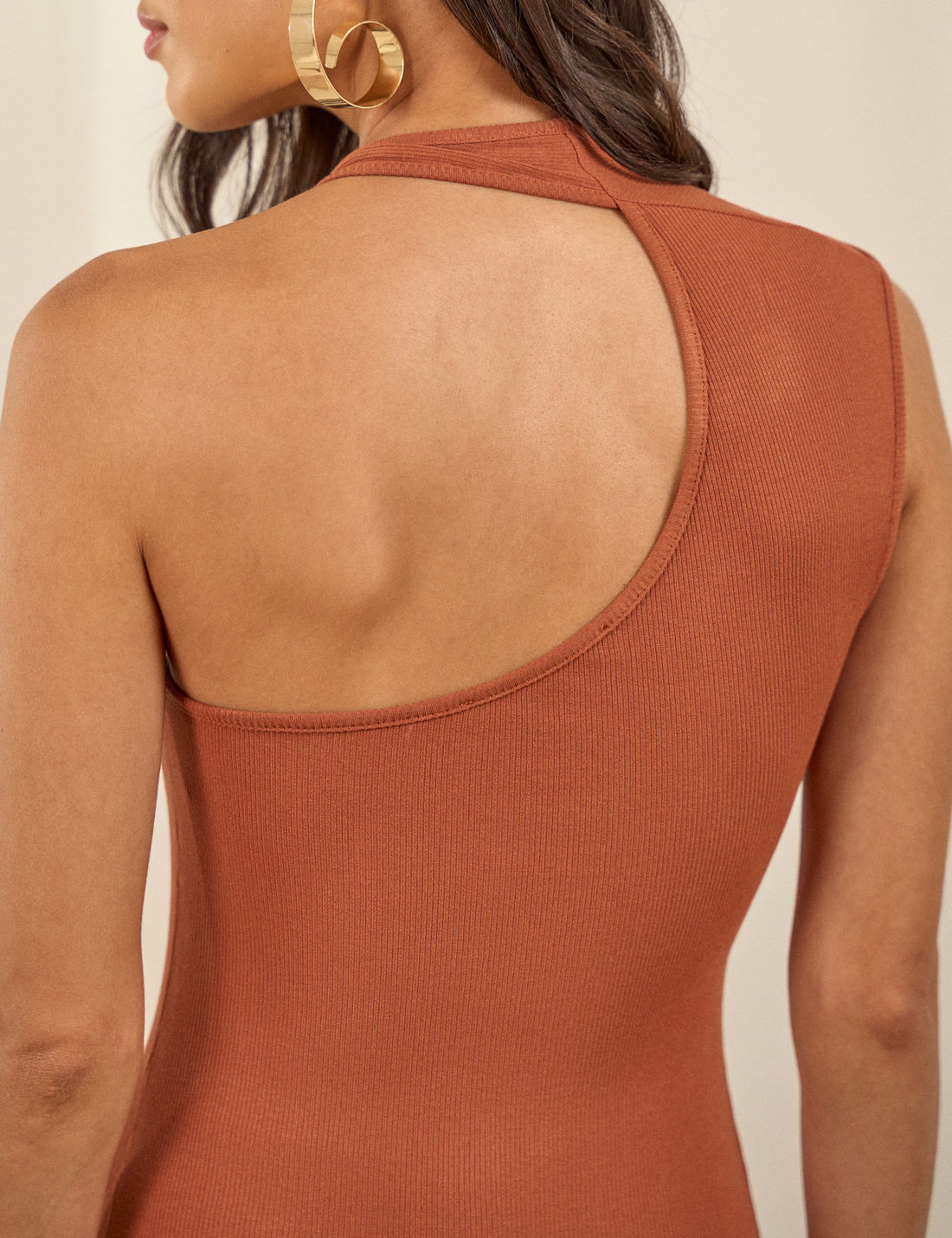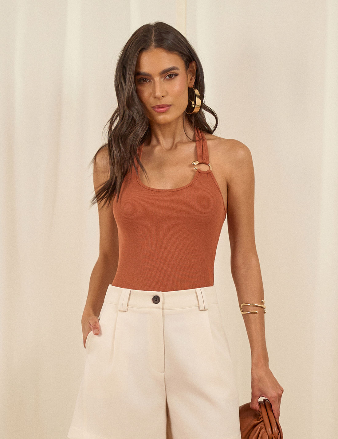 Possui decote assimétrico, sem mangas. O destaque fica por conta da aplicação de fivela metálica e vazado nas costas, conferindo um toque de estilo e personalidade à peça.