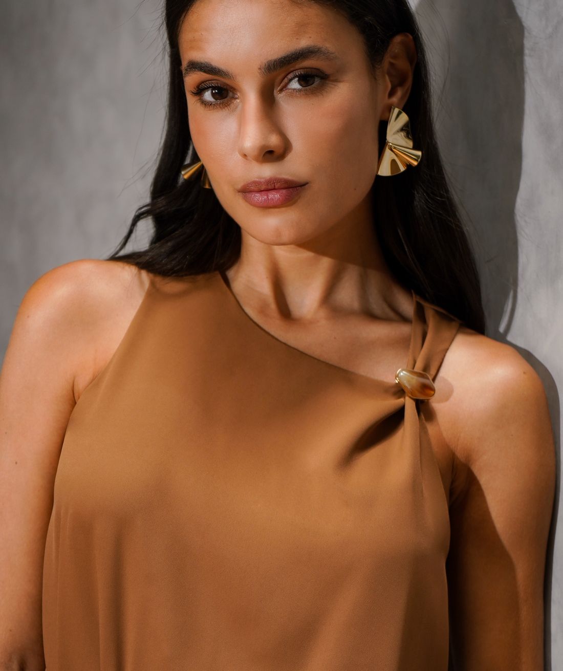 Confeccionada em crepe de caimento leve e fluido, possui modelagem reta, que valoriza o corpo sem marcar.