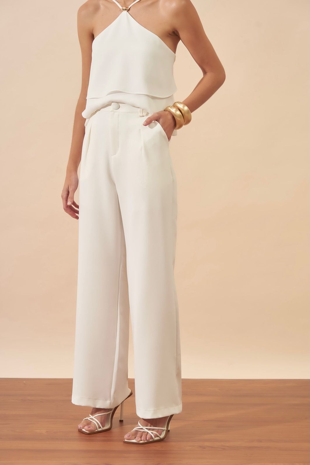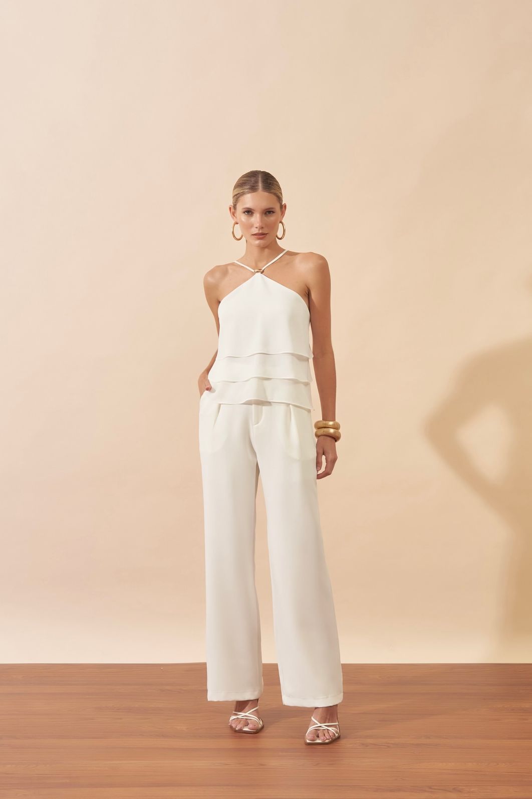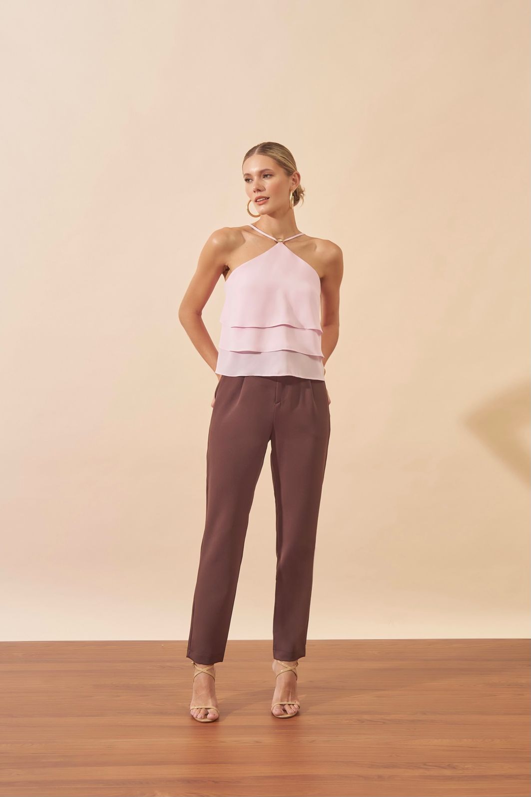 Regata Crepe Camadas com Fivela – Milalai é confeccionada em crepe fluido, garantindo caimento delicado e conforto ao vestir.