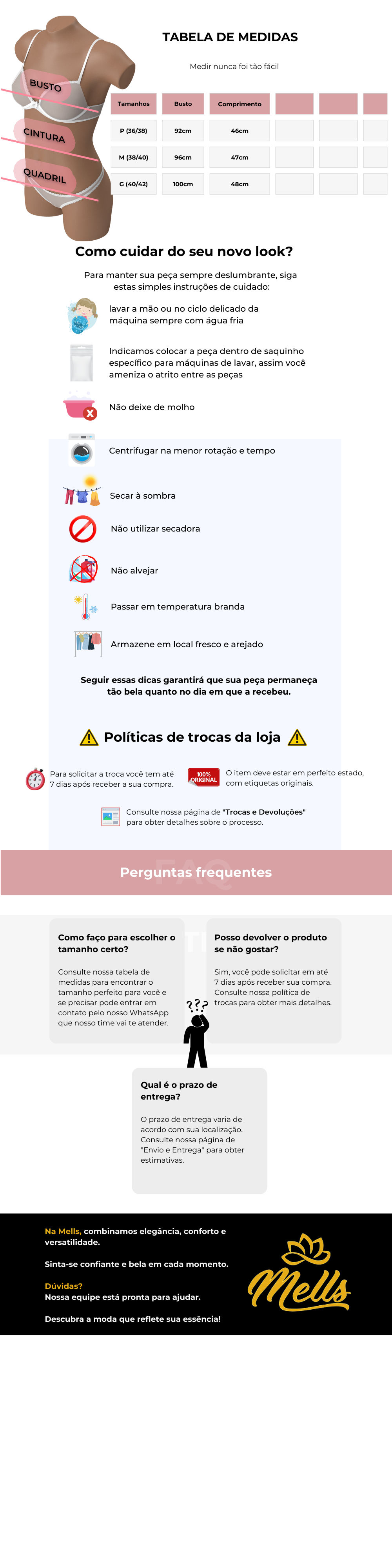 Possui corpo duplo que garante melhor estrutura e acabamento, além de decote em V que valoriza o colo com delicadeza.