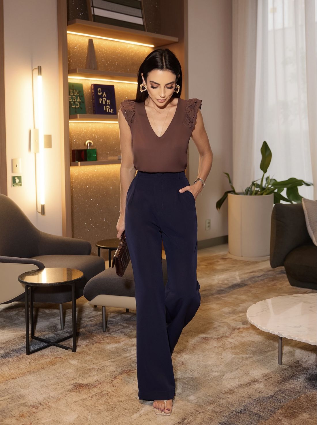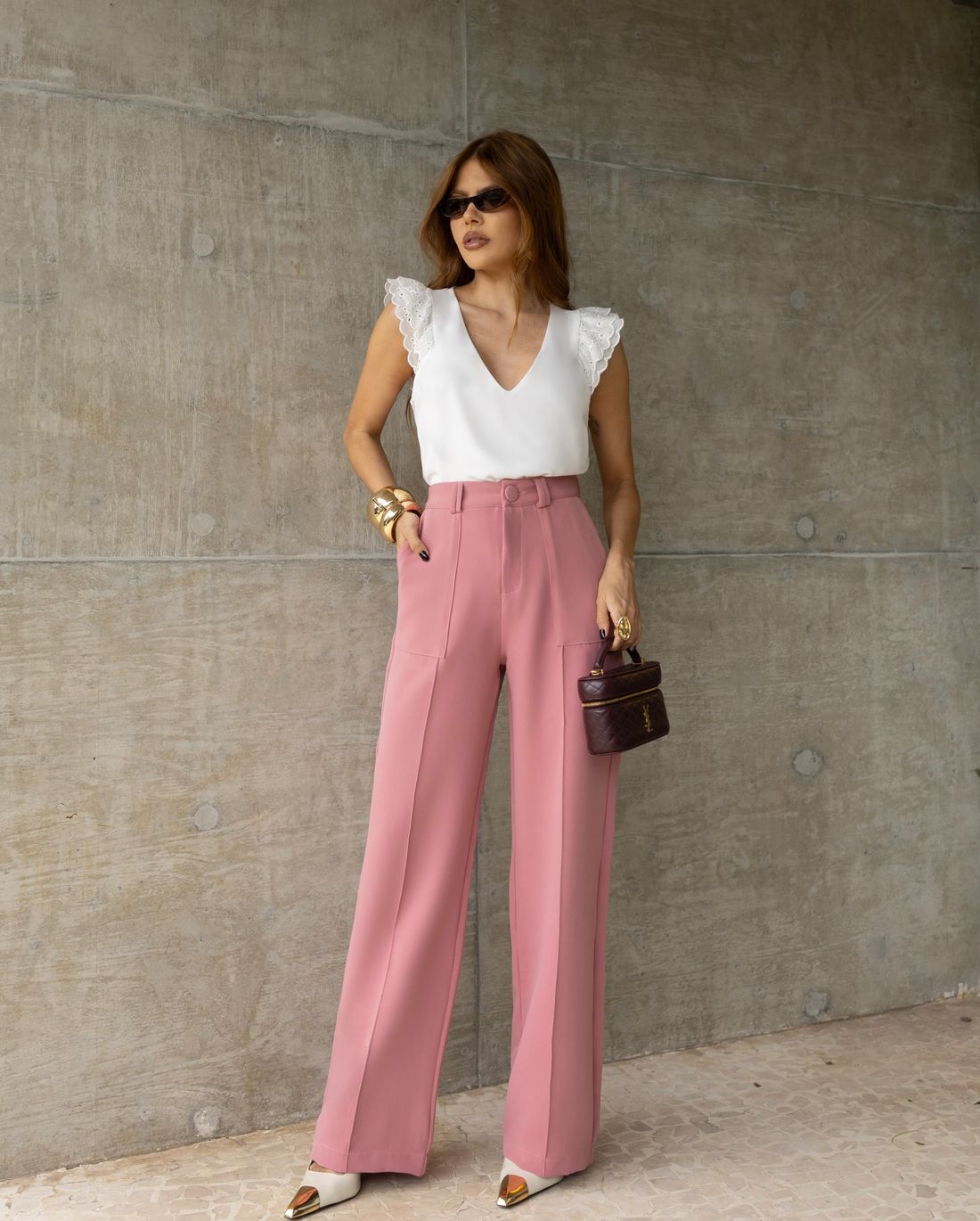 A modelagem confortável permite composições versáteis, podendo ser usada tanto em produções casuais quanto em combinações mais elegantes com peças de alfaiataria.