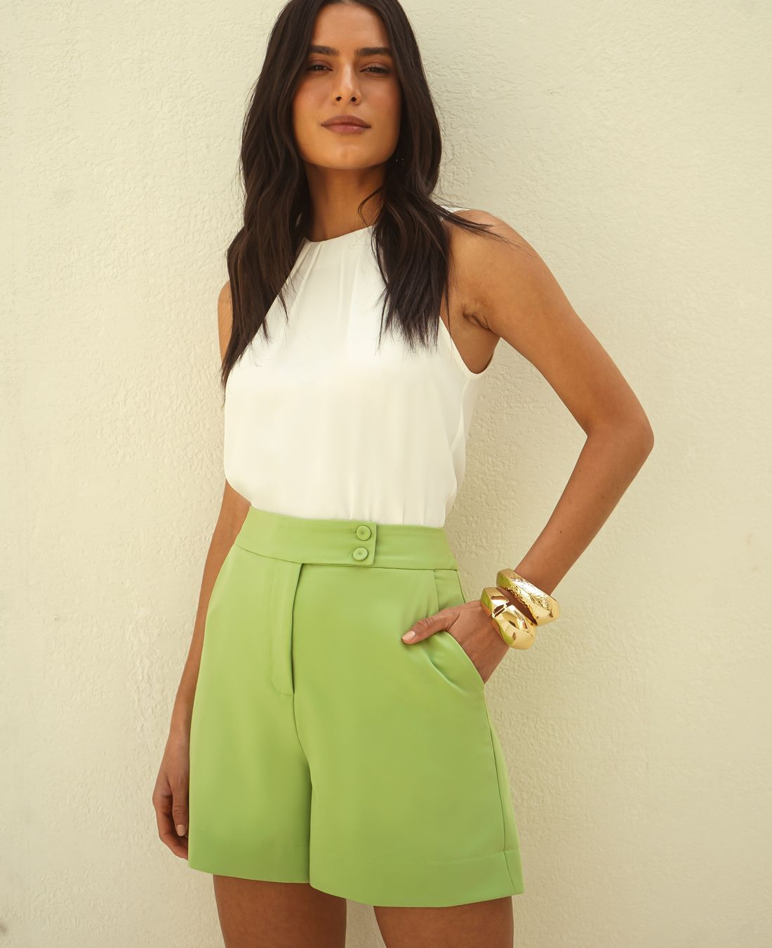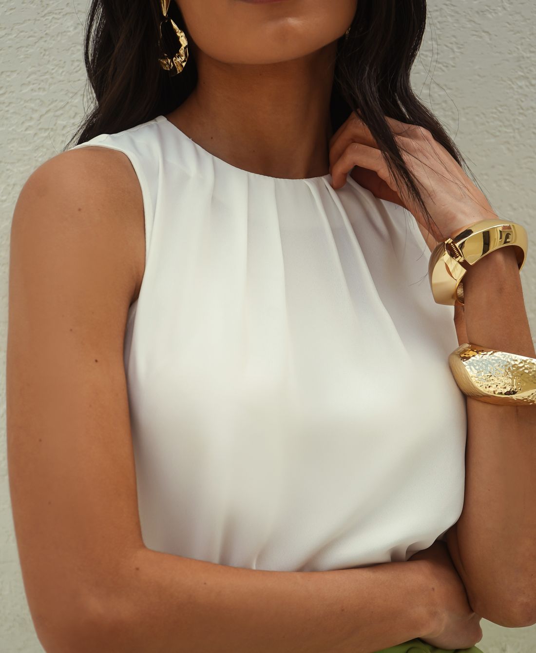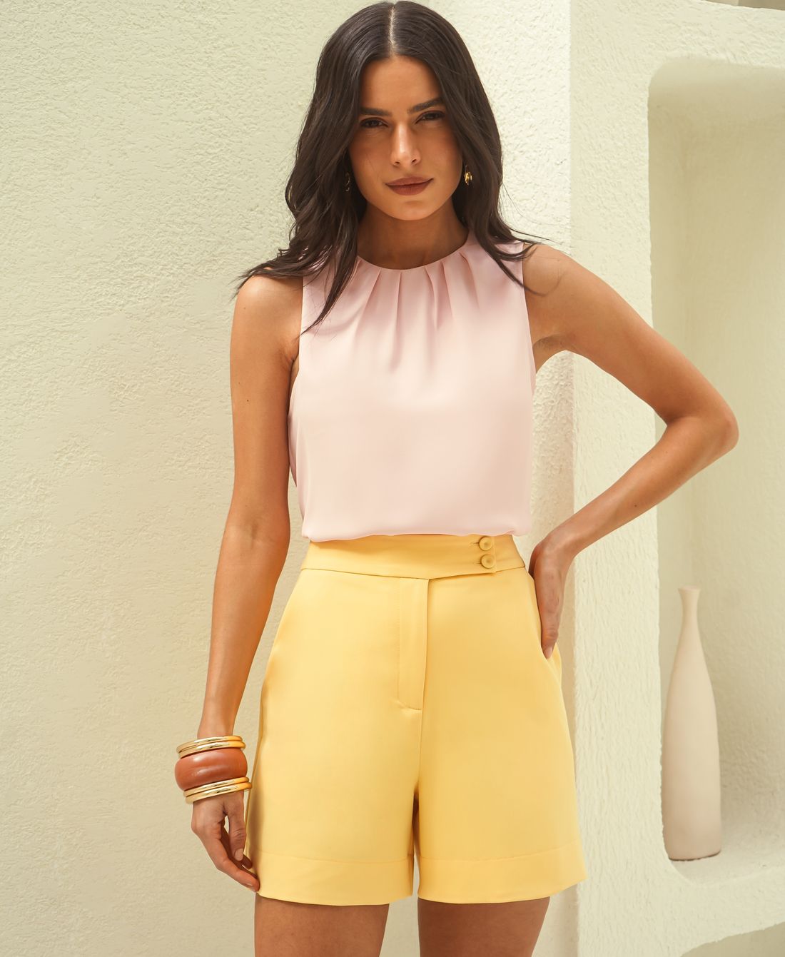 Regata em Crepe Liso é a peça perfeita para compor looks sofisticados com facilidade. Com pregas delicadas no decote que trazem um toque de feminilidade e fechamento nas costas com botão, ela alia caimento leve e acabamento refinado.