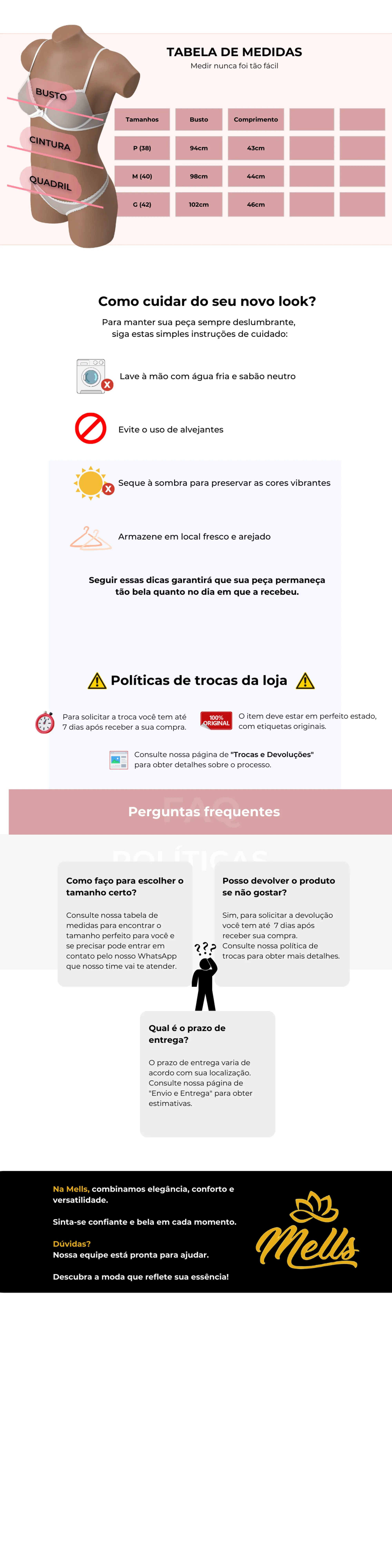 Mells Moda utiliza cookies e outras tecnologias para melhorar sua experiência de compra e personalizar anúncios, ao continuar navegando você concorda com nossa Política de Privacidade.