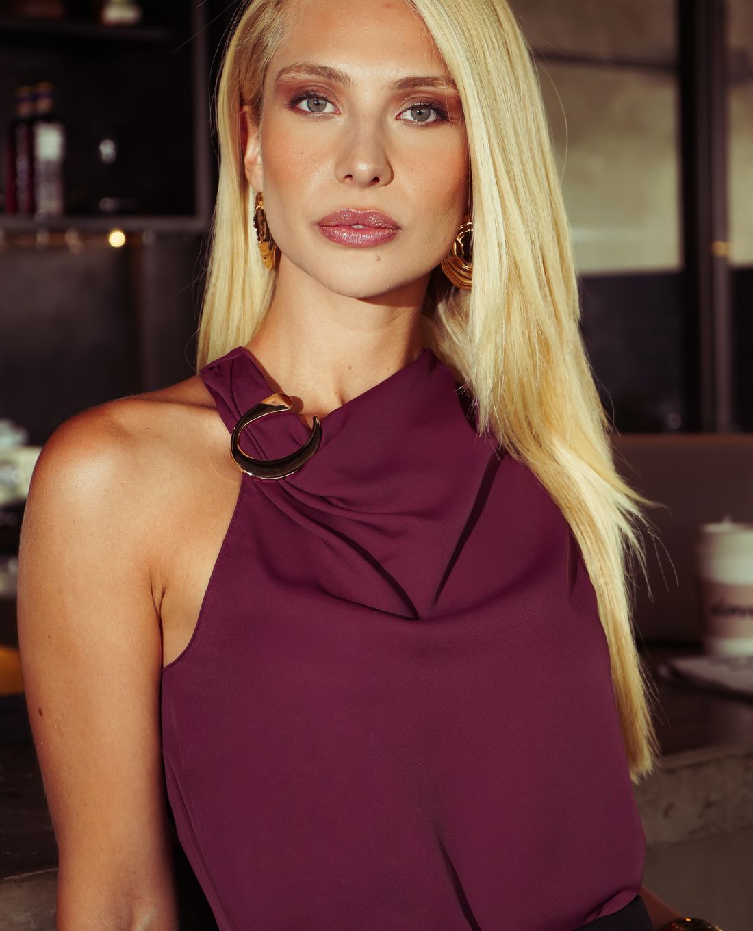 O drapeado delicado na gola cria movimento e valoriza o colo, enquanto o aviamento de metal adiciona um ponto de sofisticação e modernidade ao visual.