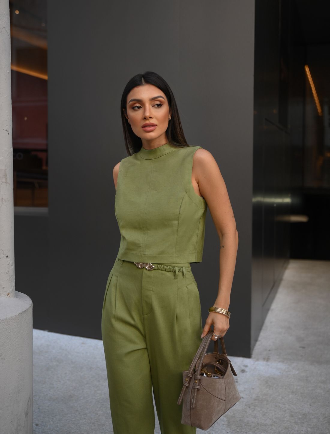 Confeccionada em tecido de viscose, linho e elastano, a peça oferece leveza, respirabilidade e conforto, com melhor caimento e menor amassado em comparação ao linho puro.