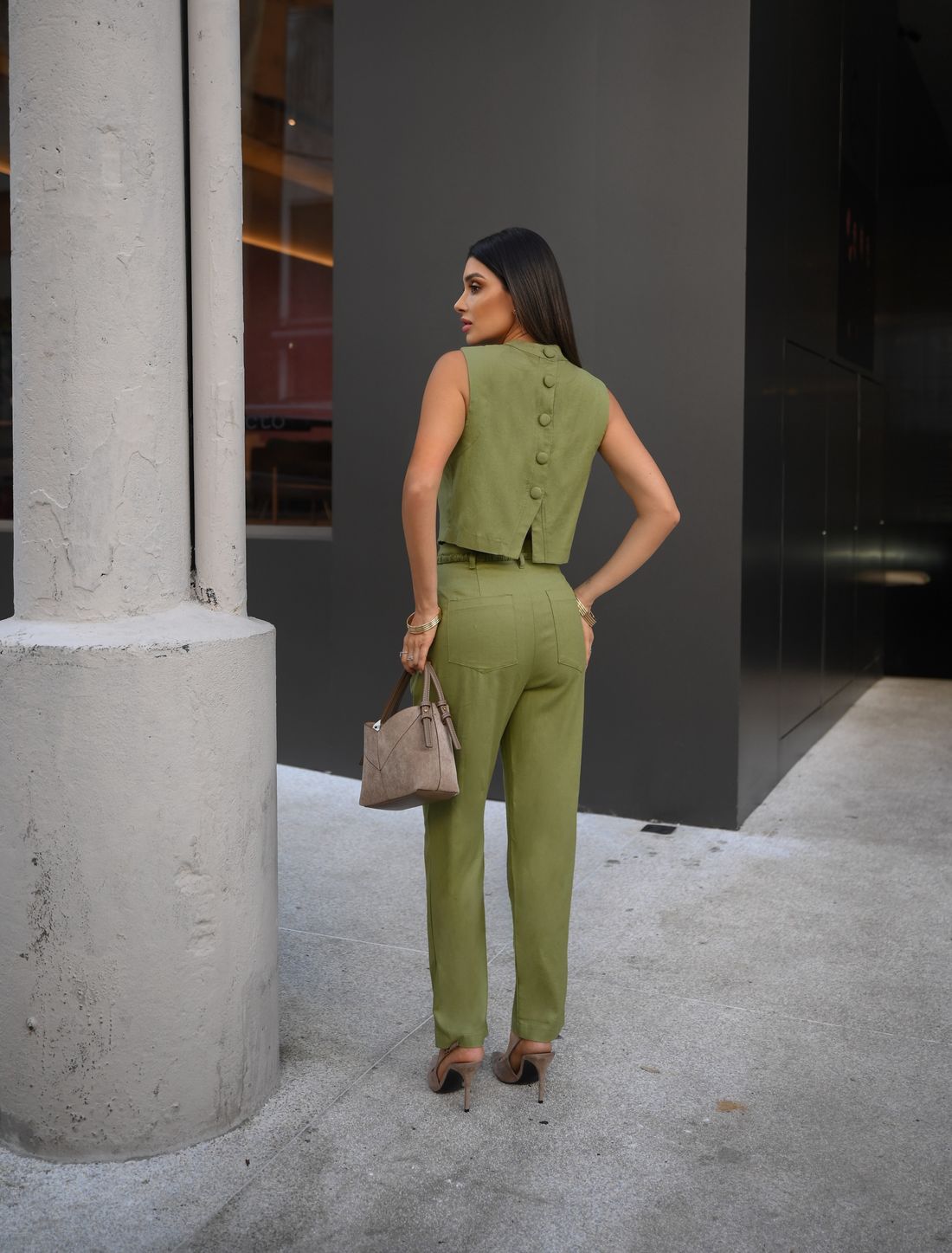 O destaque fica para os botões aplicados nas costas, que trazem charme e um acabamento diferenciado, elevando a peça sem perder a versatilidade.