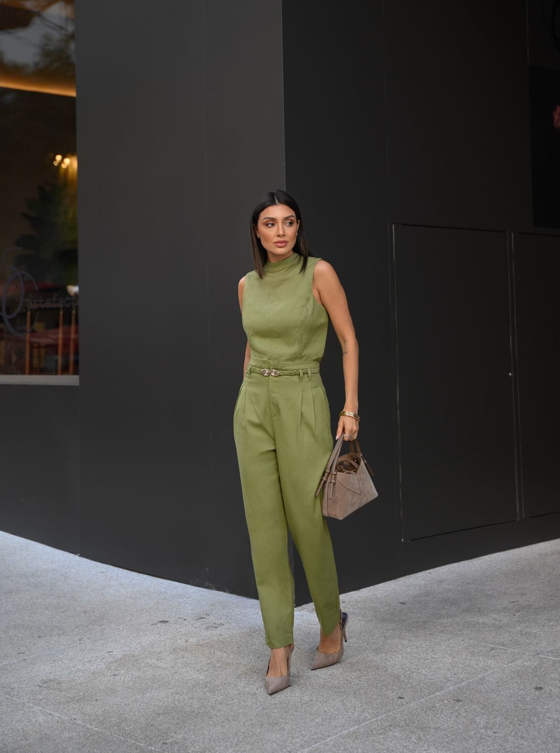 Com design minimalista e sofisticado, o modelo apresenta gola alta e recortes estratégicos que valorizam a silhueta, criando um visual clean e refinado.